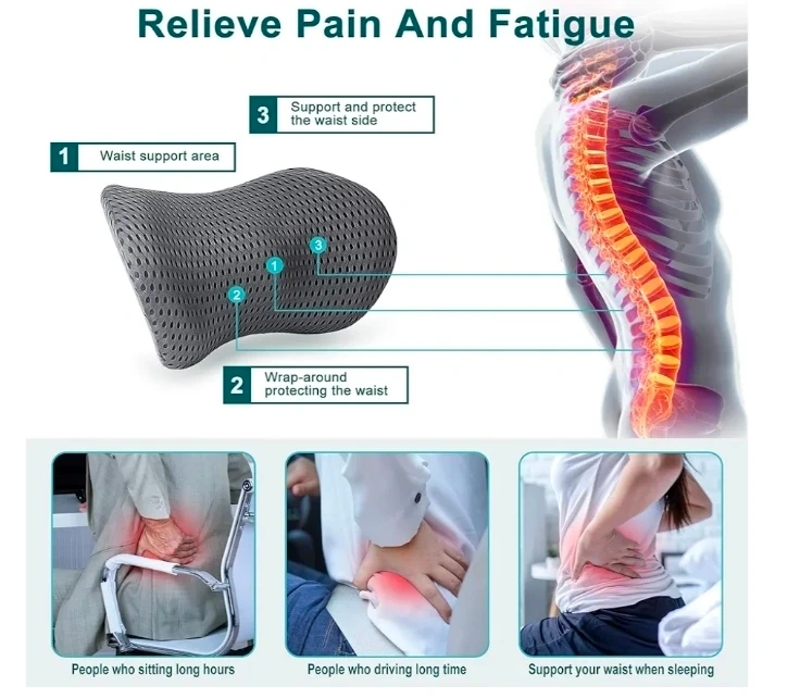 This lumbar support pillow is designed with a raised module in the "T point" area of the cross between the waist and lumbar vertebrae. It offers "C type" waist protection and "T" point waist support. It's made with high-density memory foam and breathable mesh, with a washable cover for easy cleaning. It's great for comfort on long drives and helps relieve pain and fatigue by supporting the waist area and sides