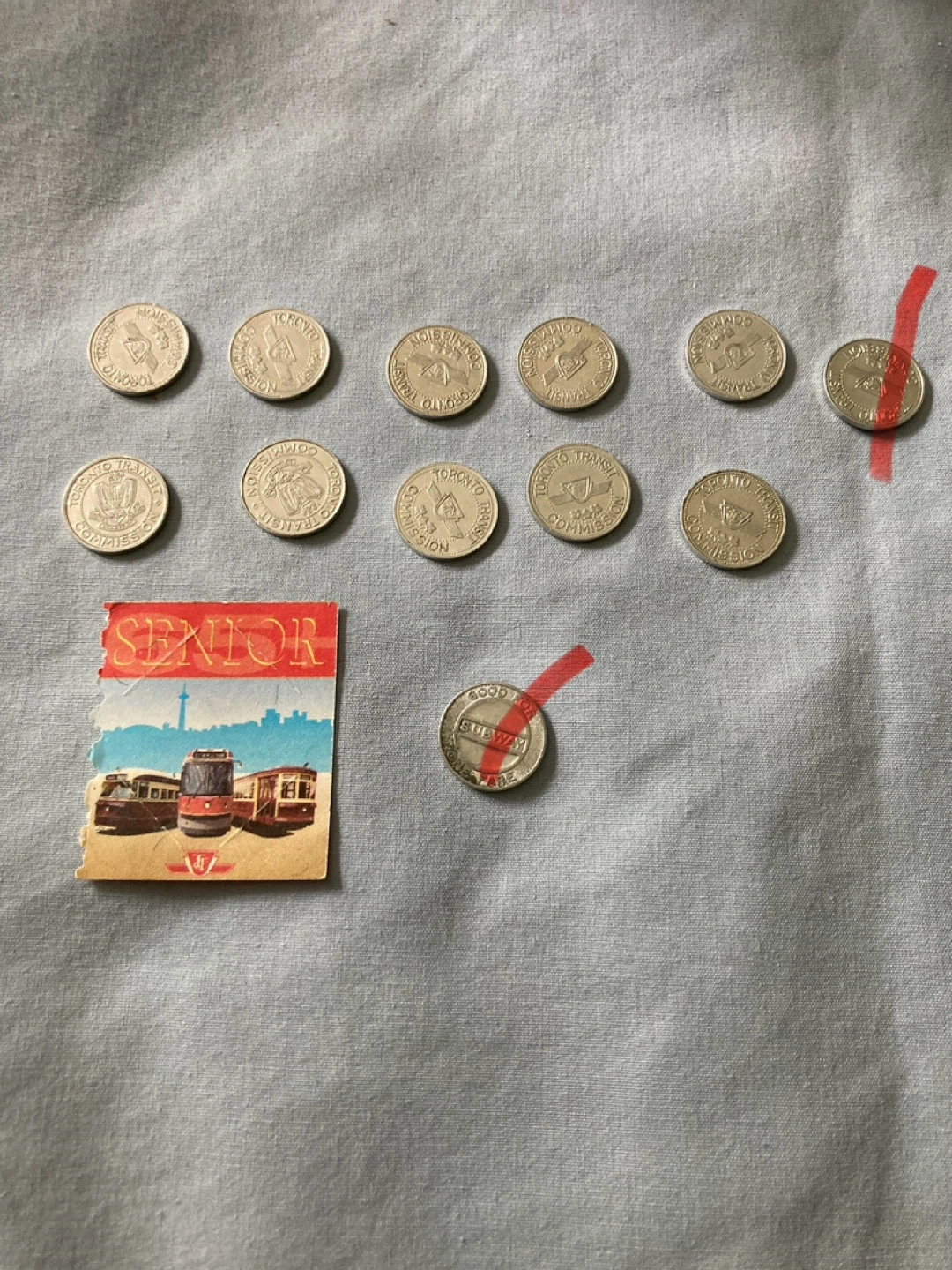 Selling a collection of vintage Toronto Transit Commission (TTC) tokens and a senior paper ticket. These are great for collectors or anyone interested in Toronto's transit history. $2 each. Same tokens in both photos, just the front and backs of each.