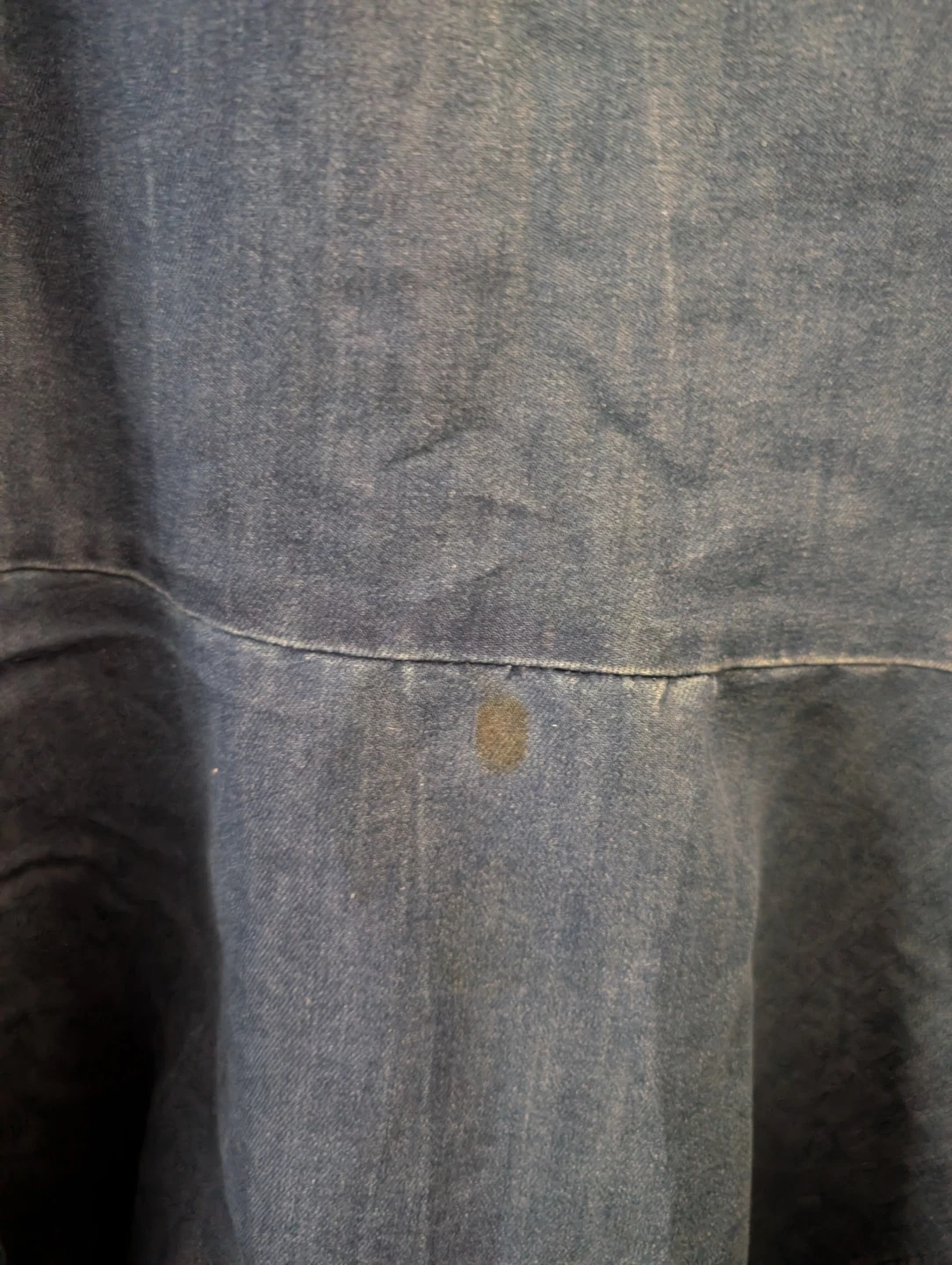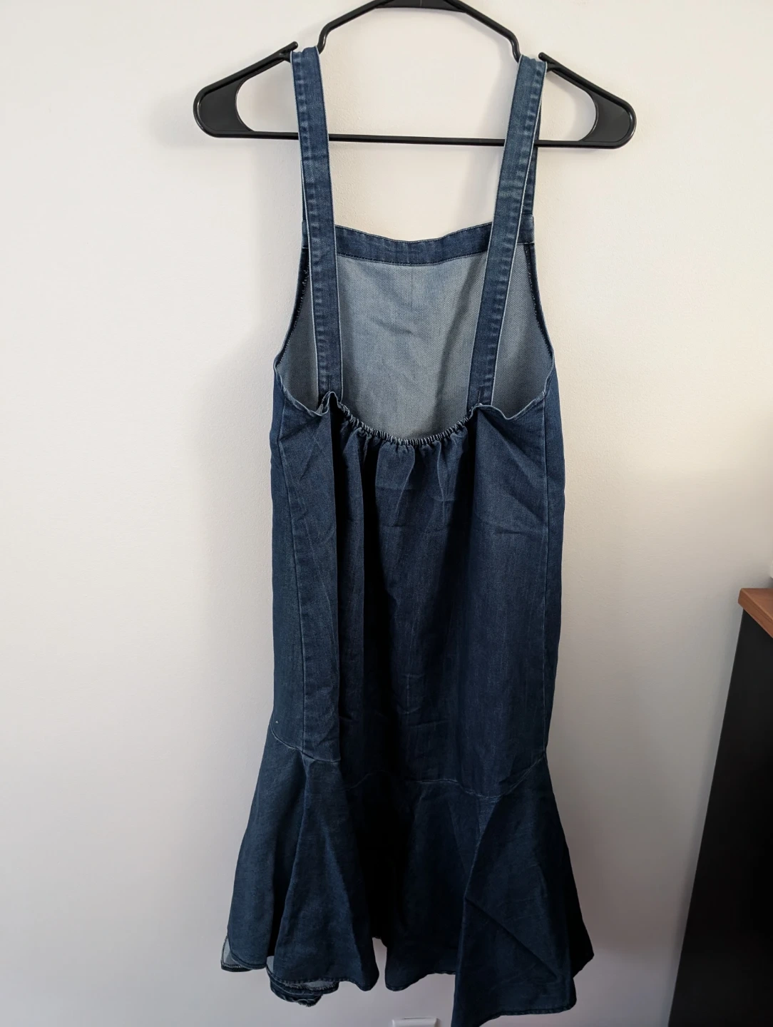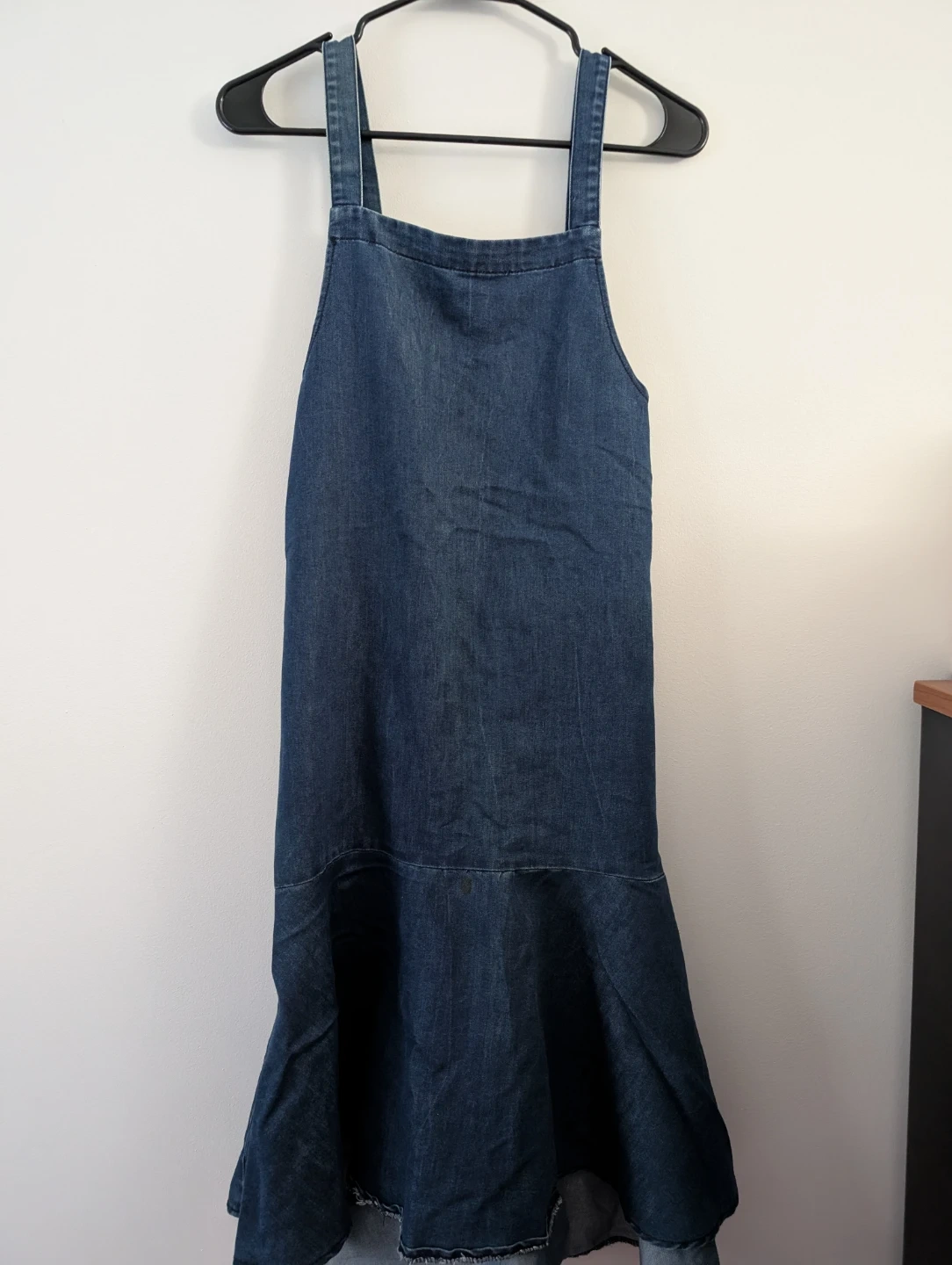 Cute denim dress in a size small! It has a unique ruffled hem. There is a small stain (not visible) on the front, as pictured.