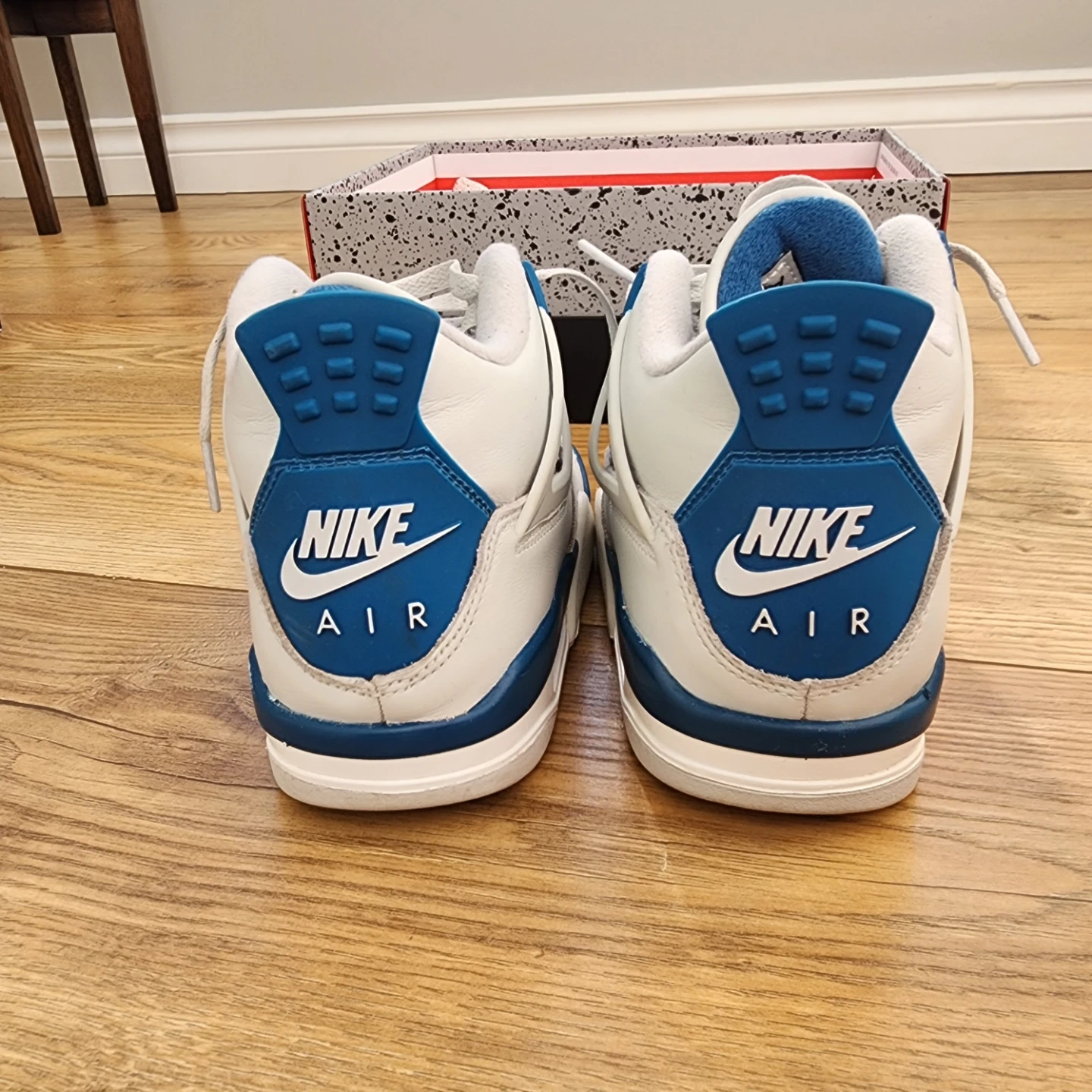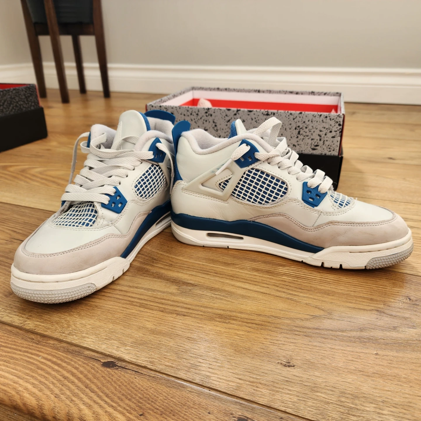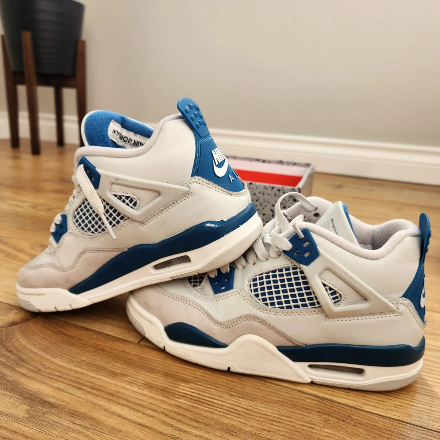 Selling a pair of Nike Air Jordan 4 Retro sneakers in white and blue! They come with the original box and are in great condition. A stylish addition to any sneaker collection!