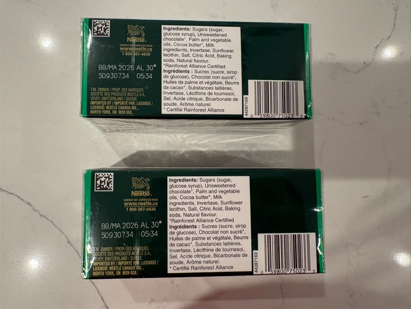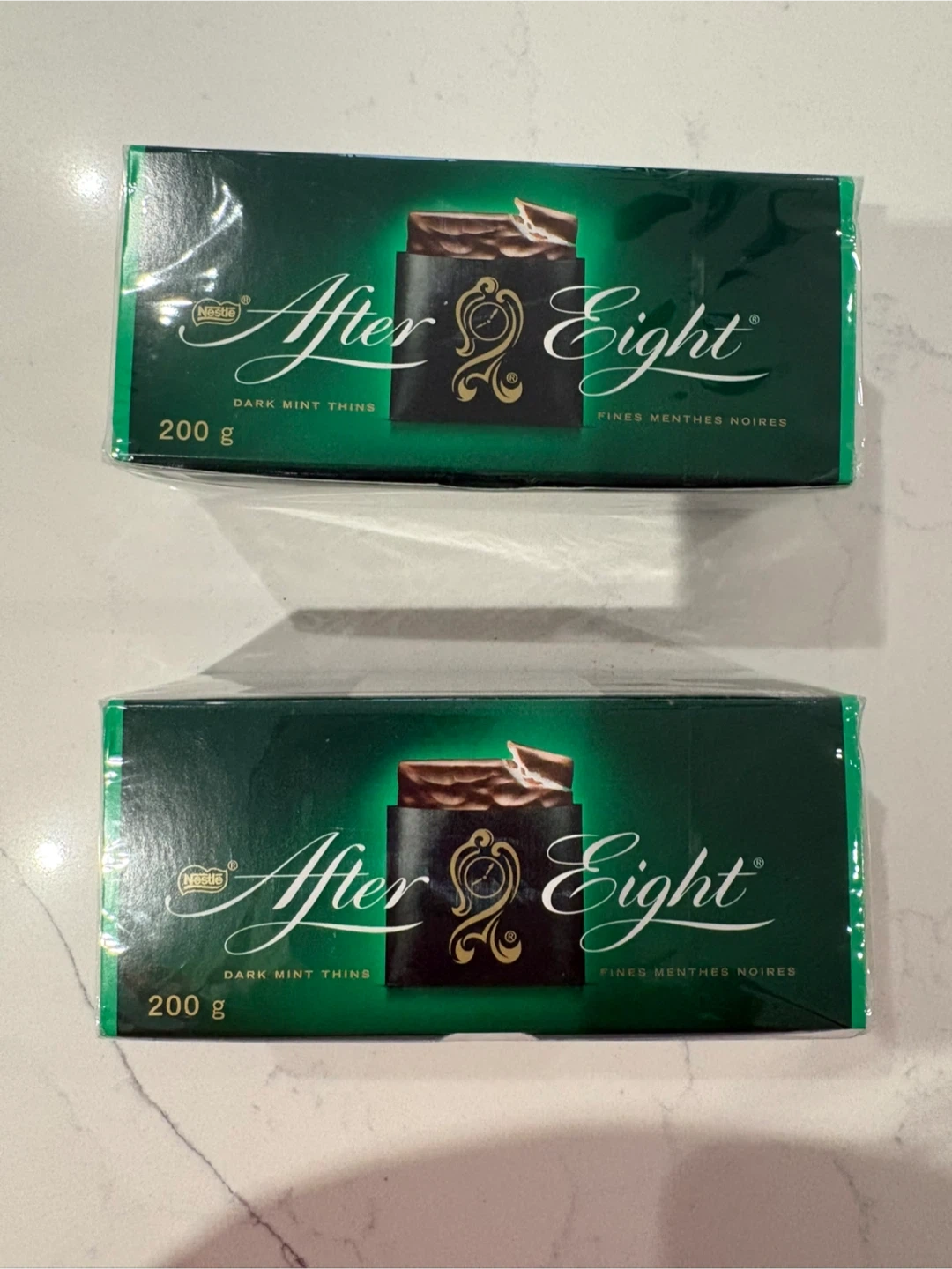 Selling two boxes of Nestle After Eight Dark Mint Thins. Each box contains 200g of delicious dark mint chocolate. The best before date is April 30 2026, so they're fresh and ready to enjoy!