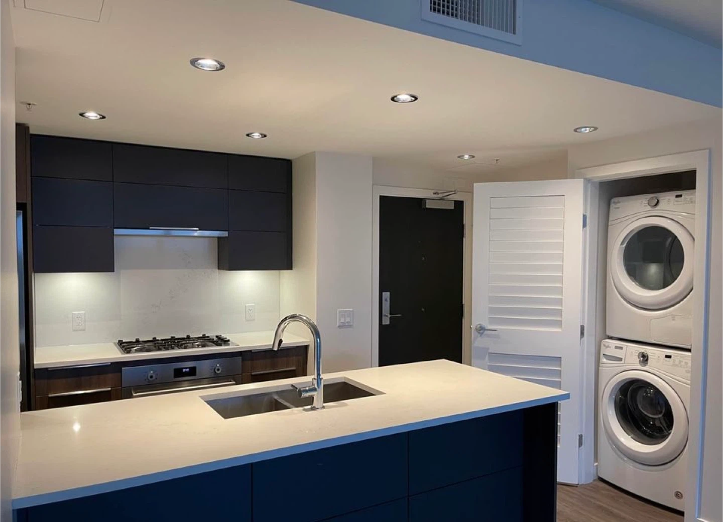 - The unit includes in-suite washer + dryer.