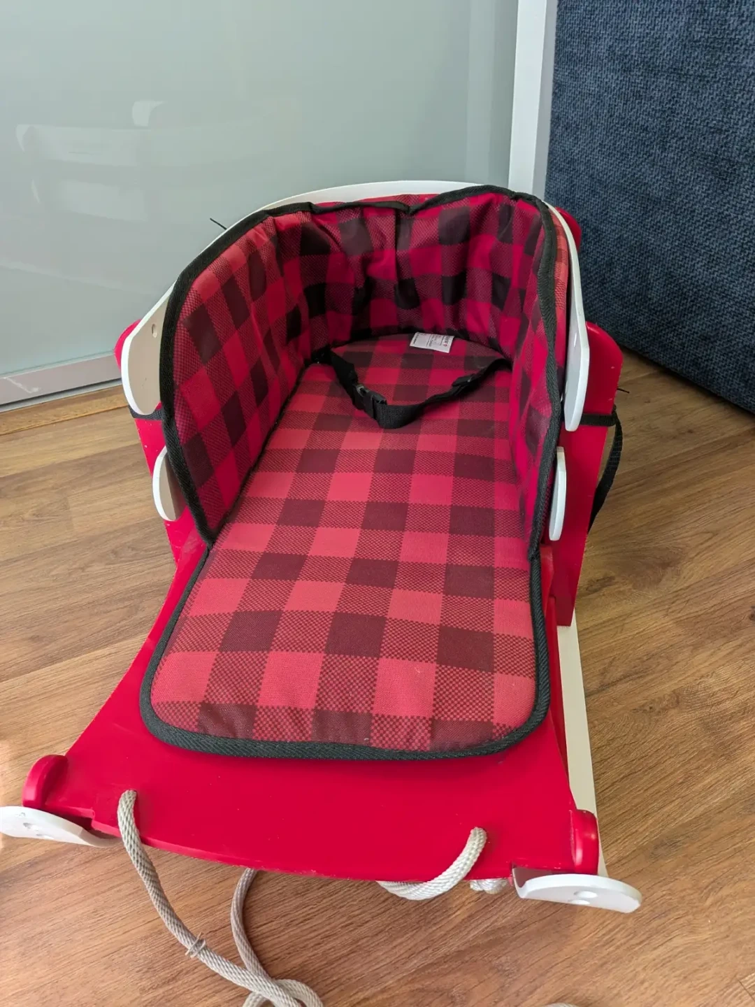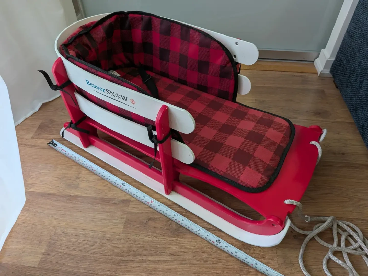 Solid plastic sleigh with waterproof insert and rope to pull.