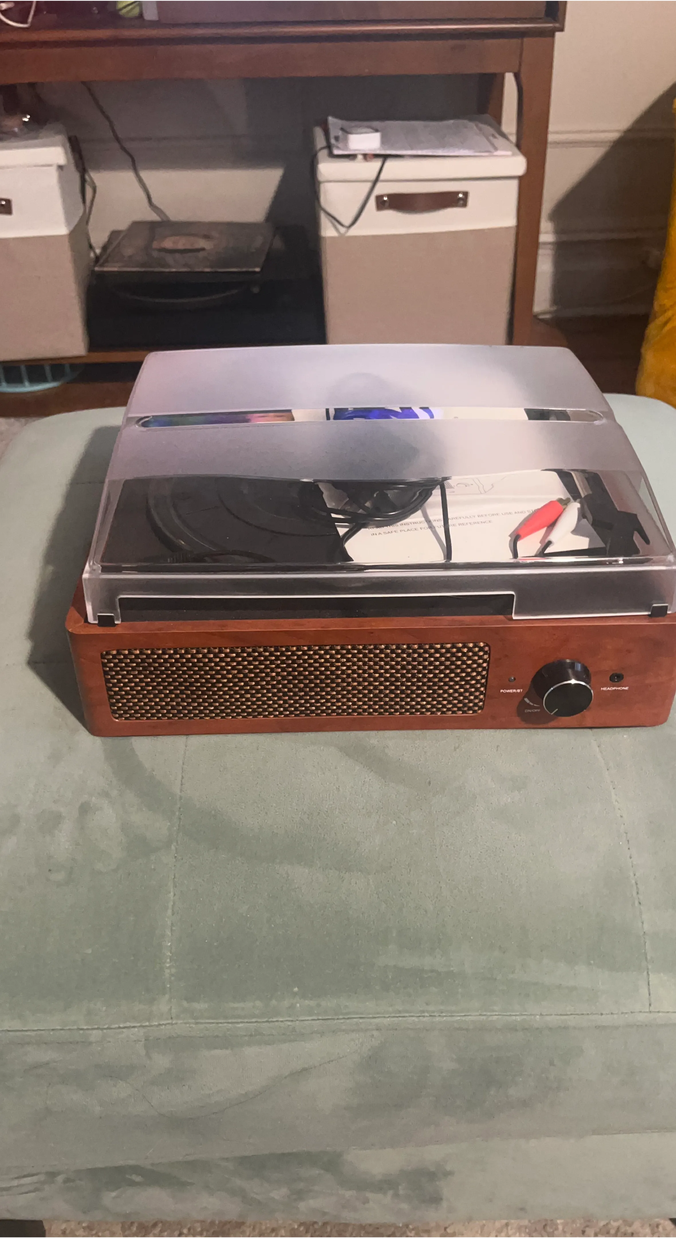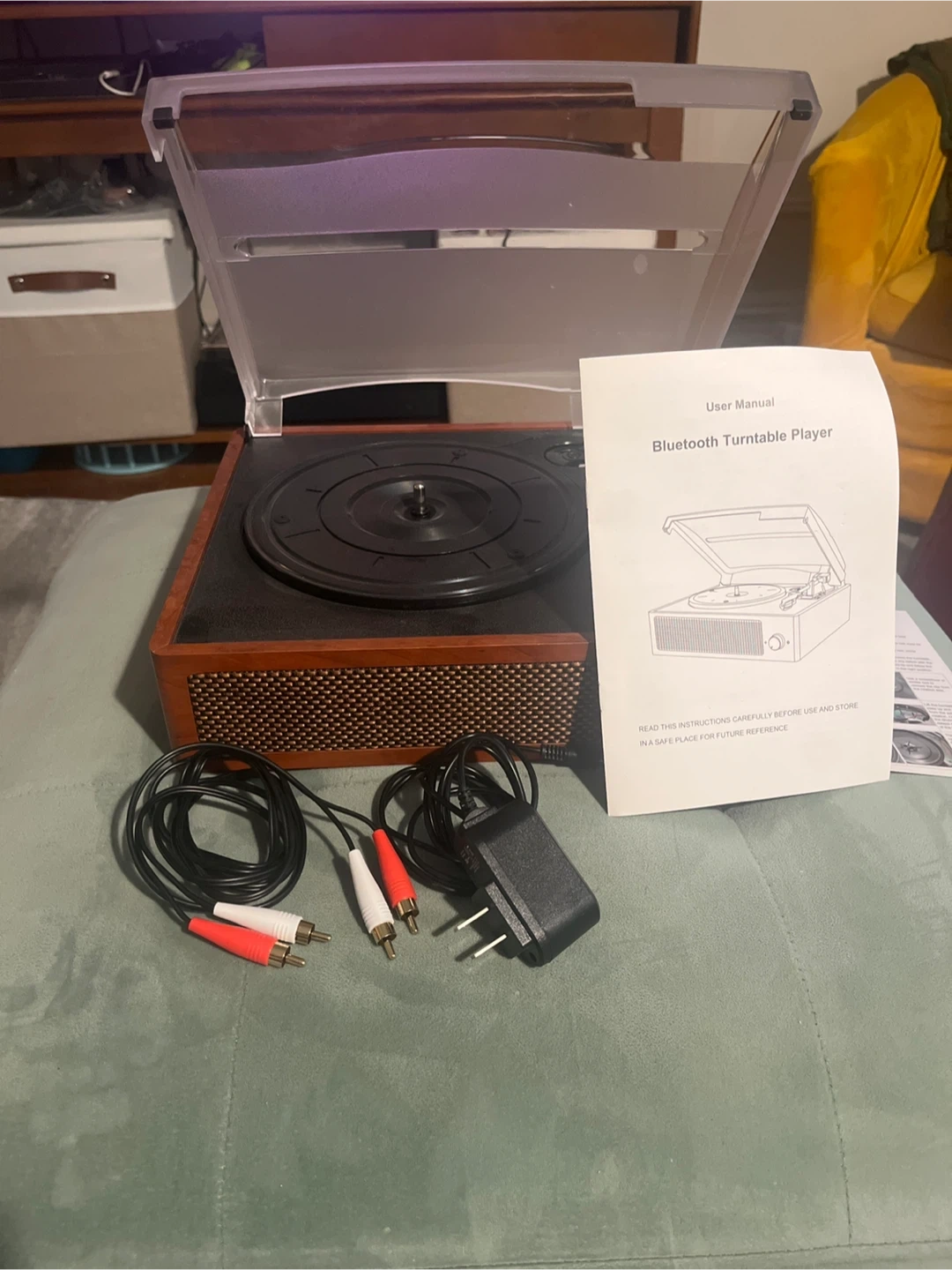 Selling a turntable vinyl record player. It comes with a user manual, power adapter, and audio cables. Has built in speakers that works as Bluetooth speaker as well. Great beginner turntable.