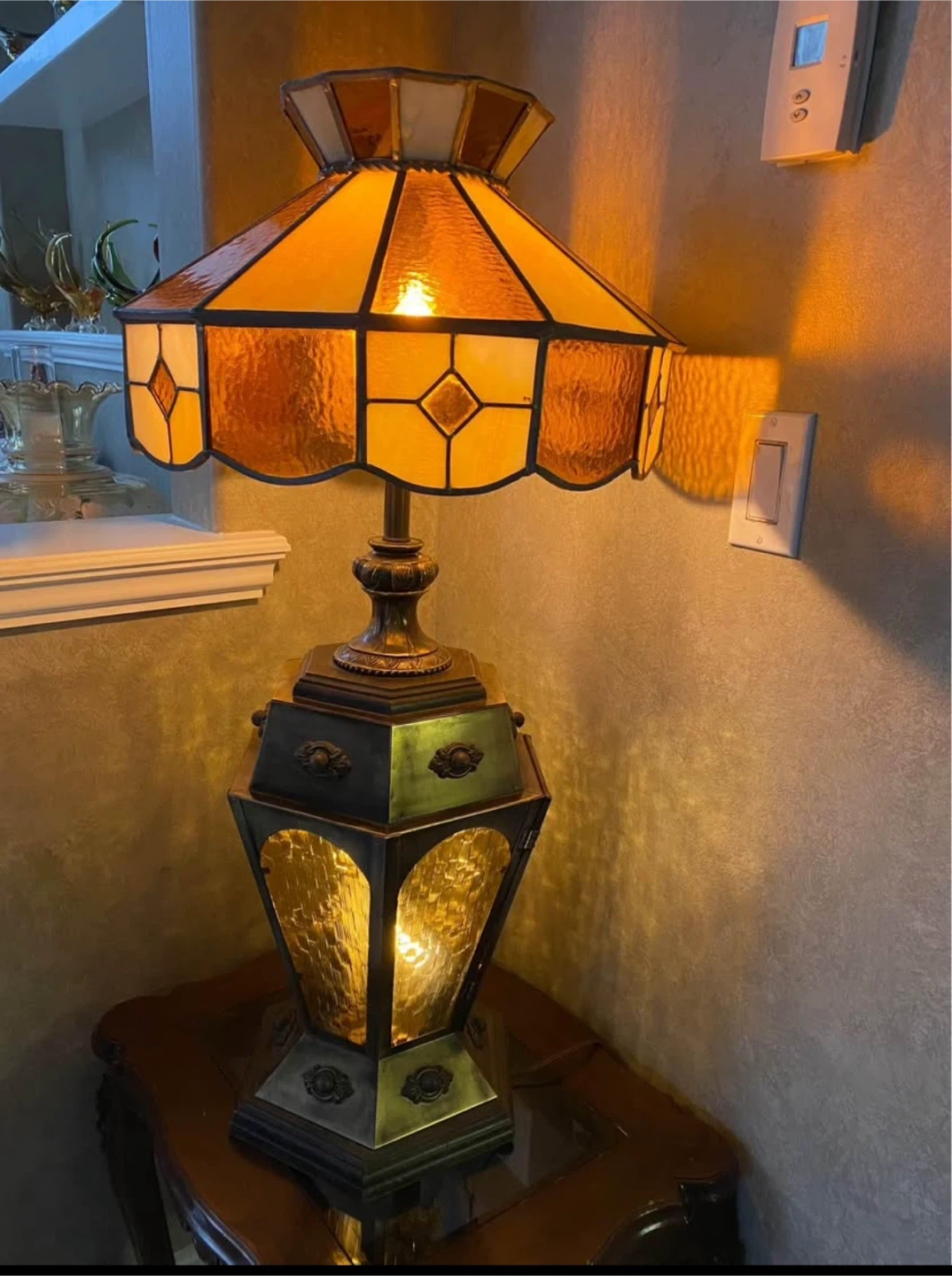 Here's a beautiful vintage table lamp with a stained glass shade. It has a unique design and would look lovely in any room. The base has an antique look, and the lamp gives off a warm, inviting glow!