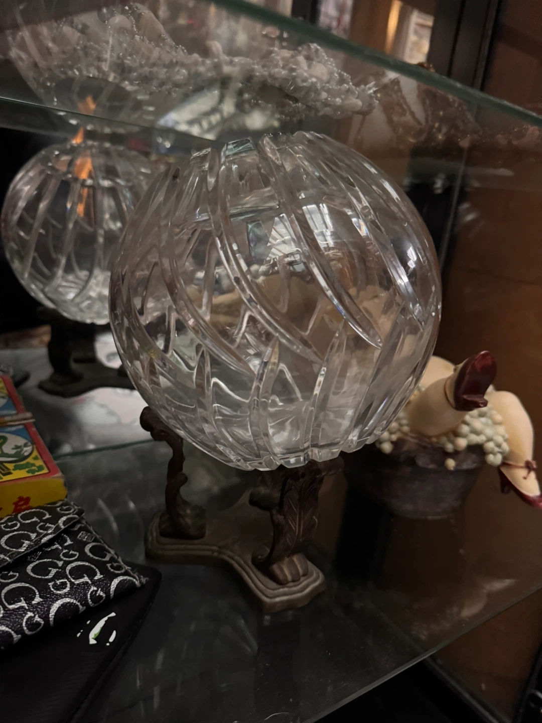 Selling a beautiful crystal ball vase with a decorative stand. It's in great condition and would make a lovely addition to any home