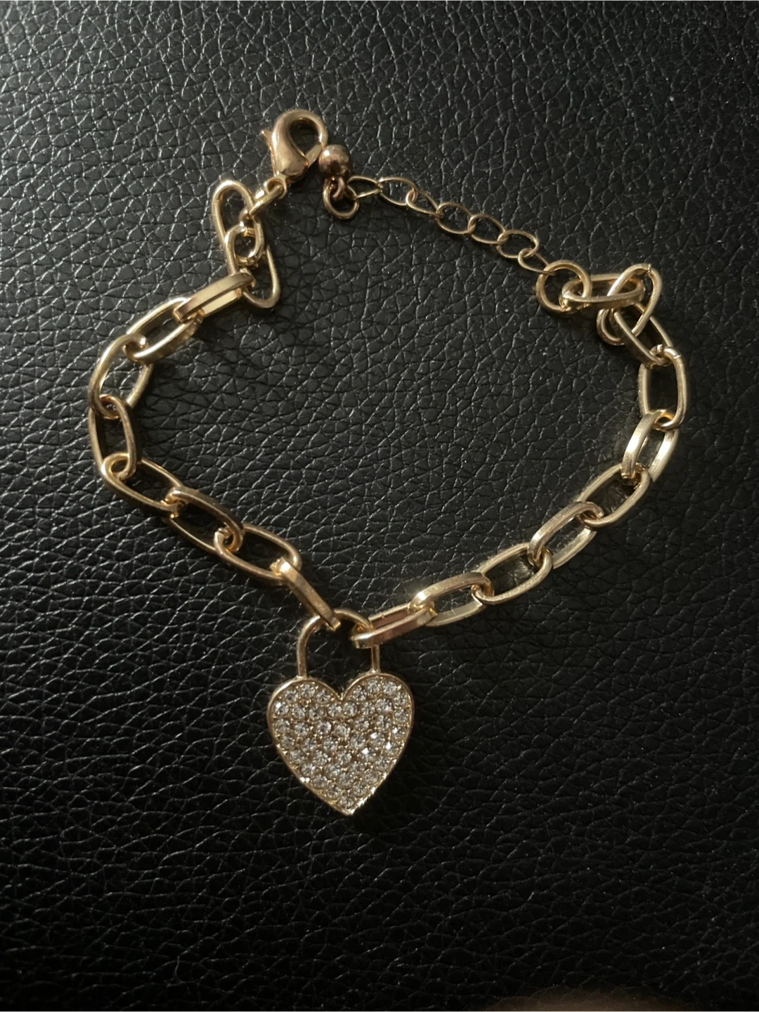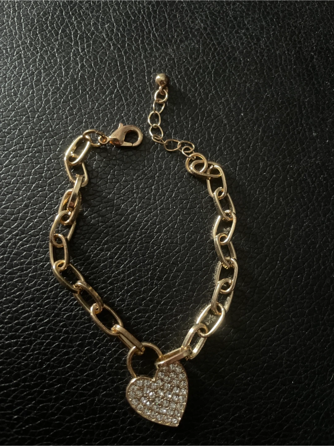 Selling a cute gold-coloured charm bracelet! It features a heart-shaped charm covered in rhinestones. It's a lovely piece to add a bit of sparkle to your outfit