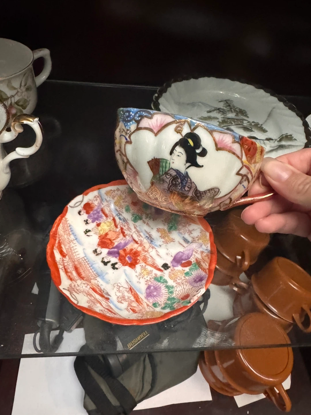 Selling a beautiful vintage Japanese tea cup and saucer set. The cup features a delicate geisha design, and the saucer has a lovely floral pattern. Perfect for adding a touch of elegance to your tea time