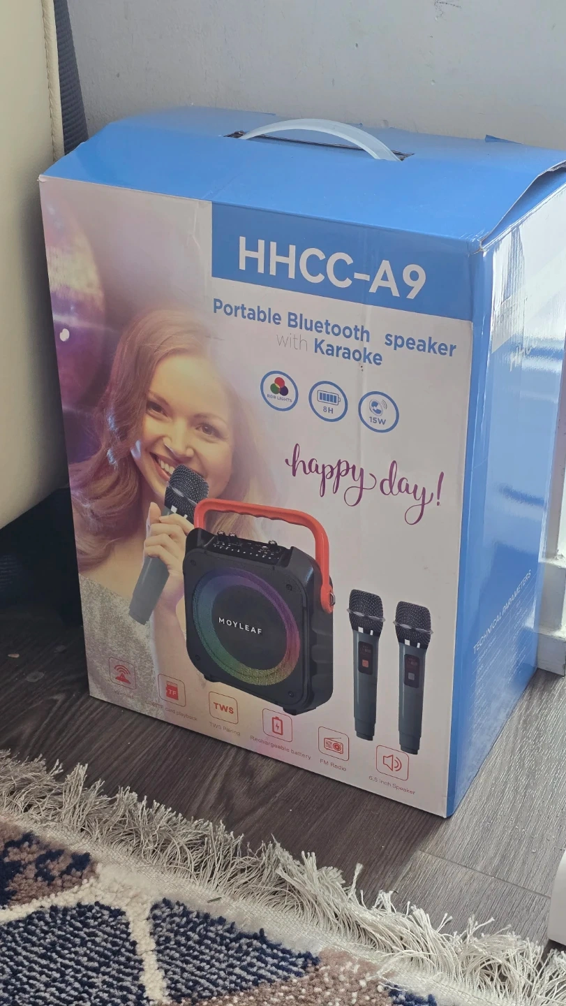 Get ready to sing your heart out with the MOYLEAF HHCC-A9 portable Bluetooth speaker! This karaoke machine comes with two microphones and features: