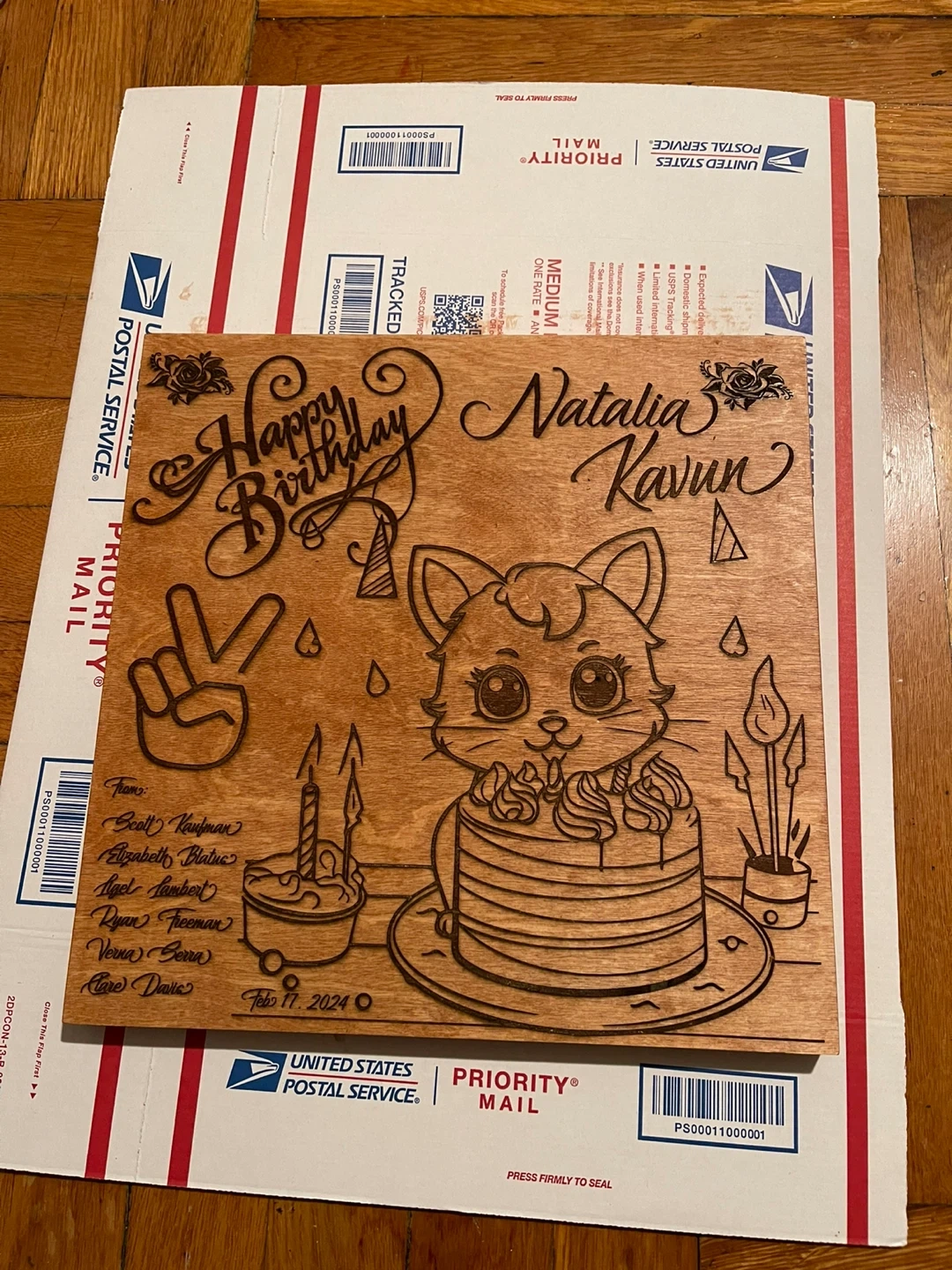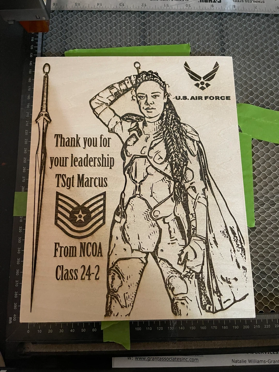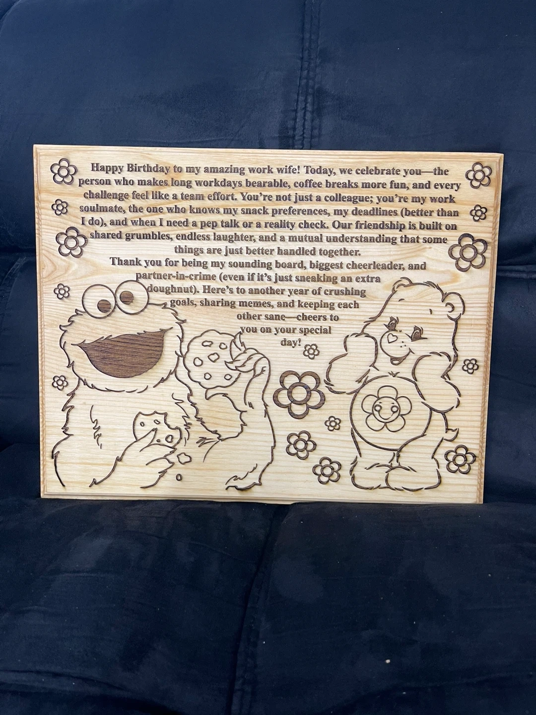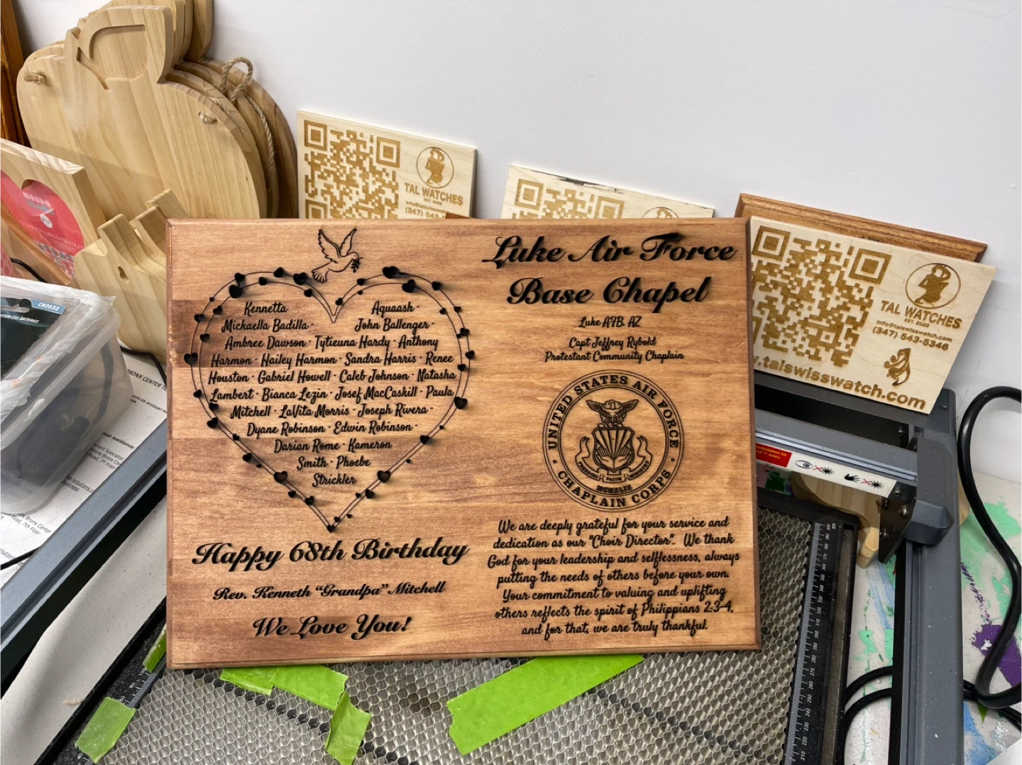 Send a design, size/dimension of the item you would like (example, 5”x7” or 8.5”x11”, etc), name or message and I can laser engrave it for you.