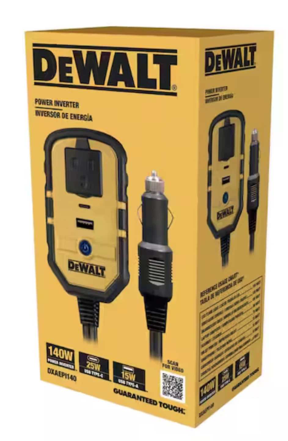Selling a DEWALT 140W Power Inverter, model DXAEP1140. It features a 25W USB Type-C and a 15W USB Type-A port. Guaranteed tough!