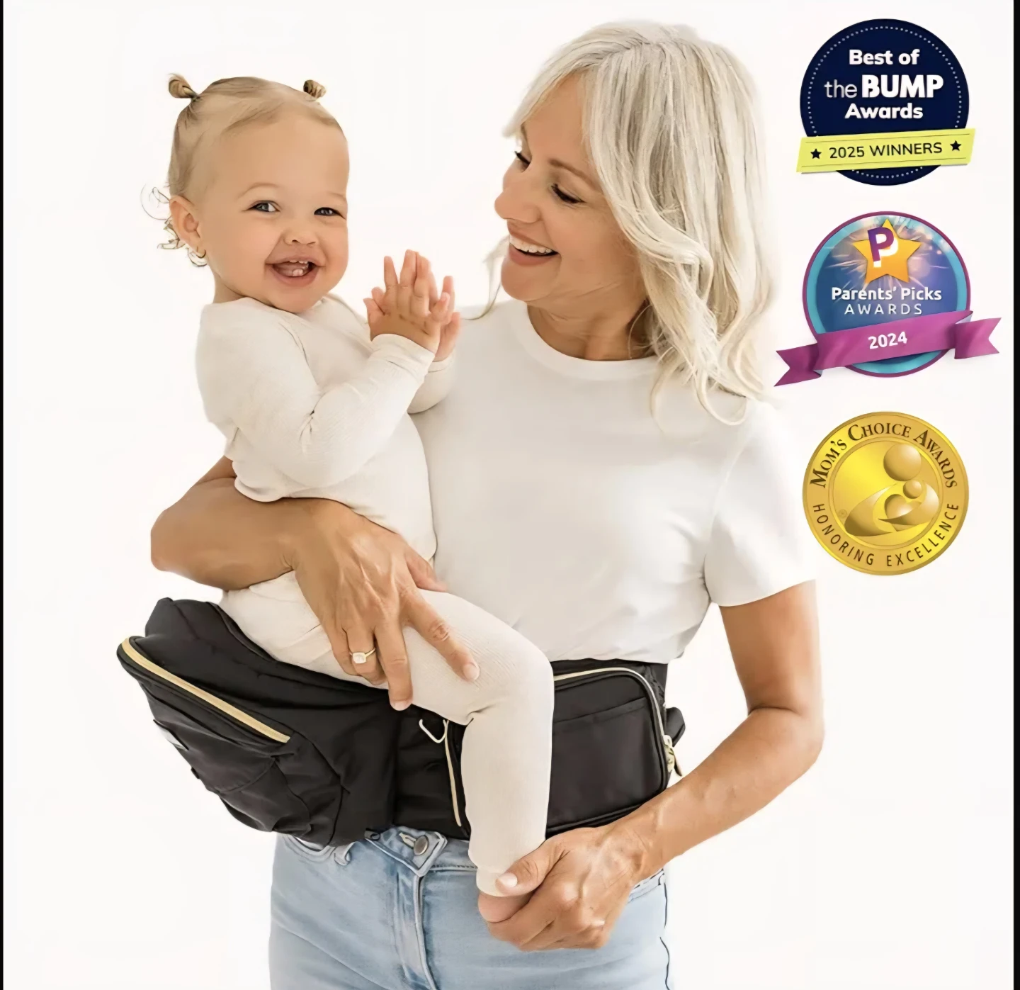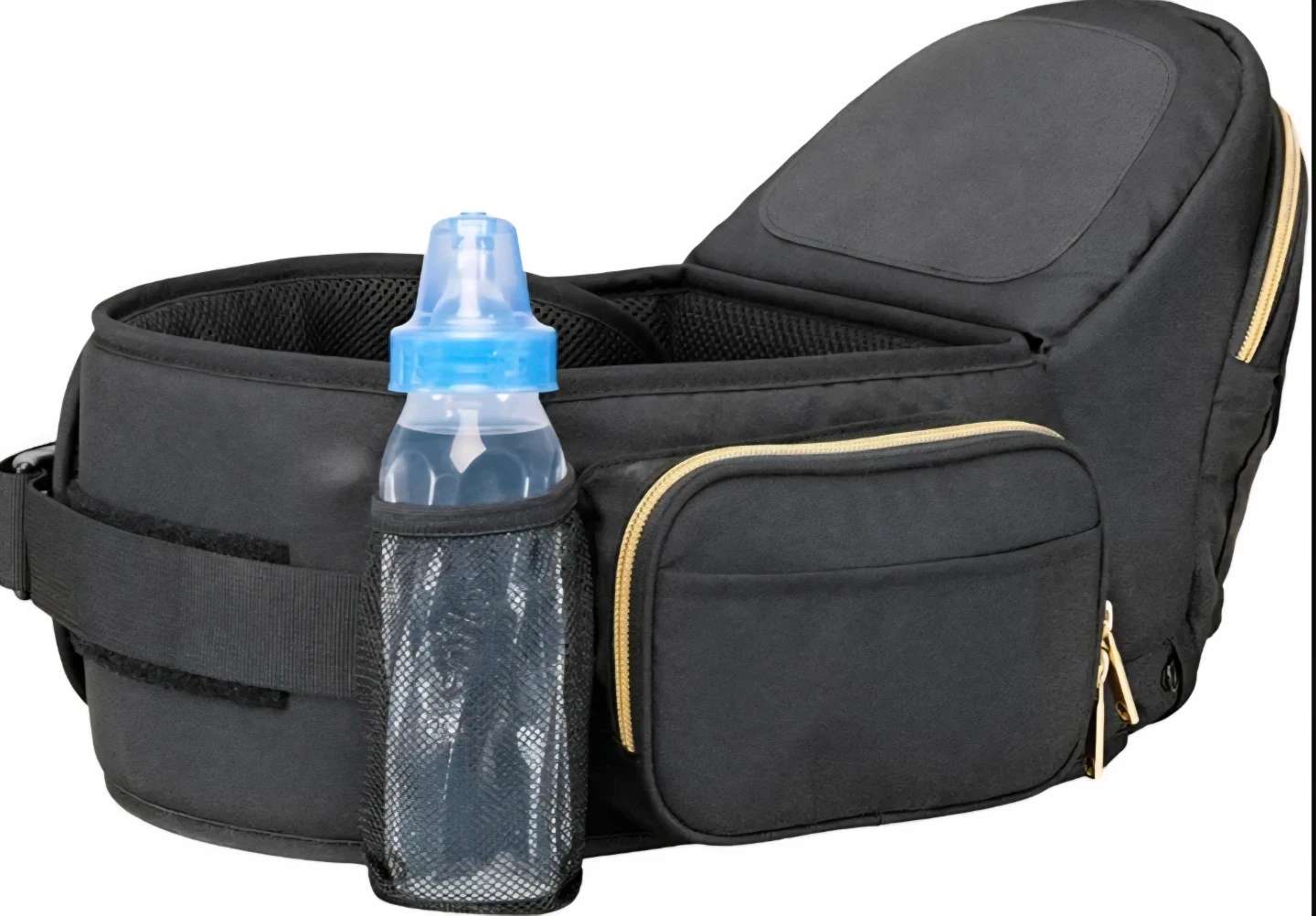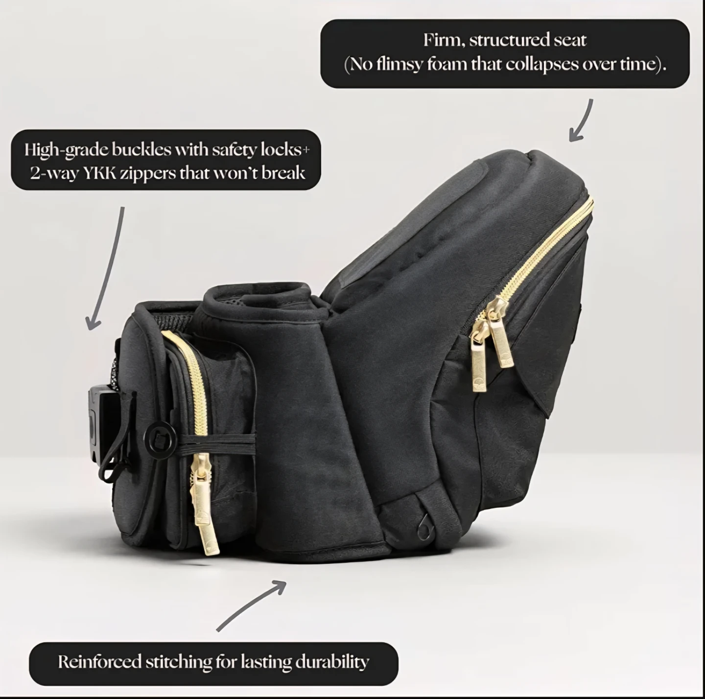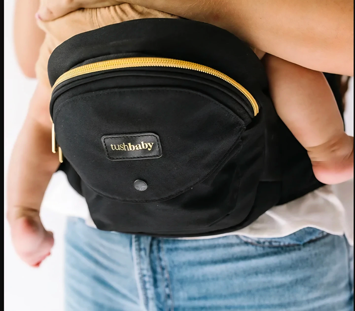 Check out this Tushbaby hip seat carrier in Black & Gold! It's designed with high-grade buckles and safety locks, plus 2-way YKK zippers that won't break. The seat is firm and structured, and the stitching is reinforced for lasting durability. It's a great way to comfortably carry your little one!