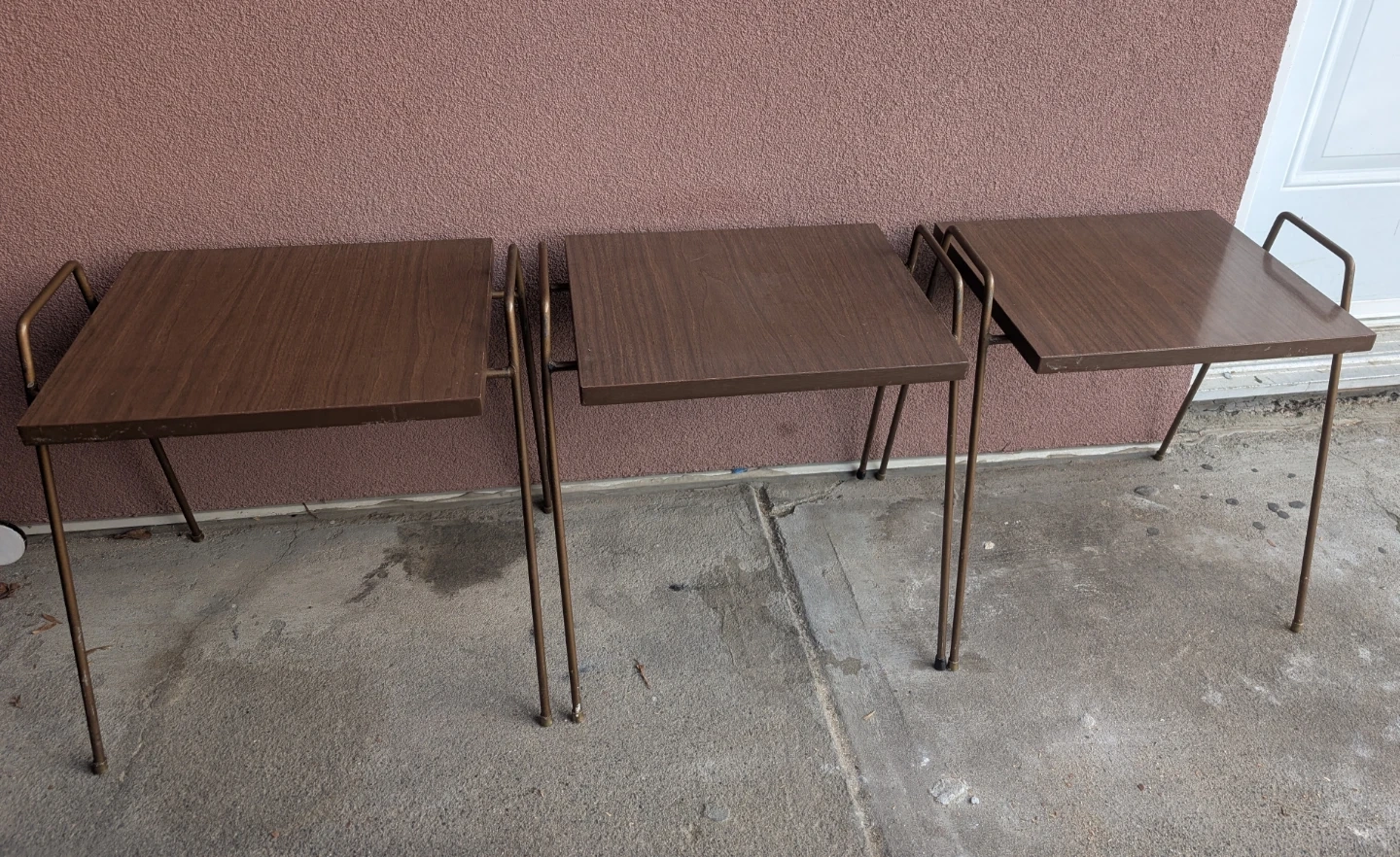 Selling a set of three vintage nesting tables. They have a unique design and are perfect for adding a retro touch to your living space. The tables are in good condition and ready to be used in your home!