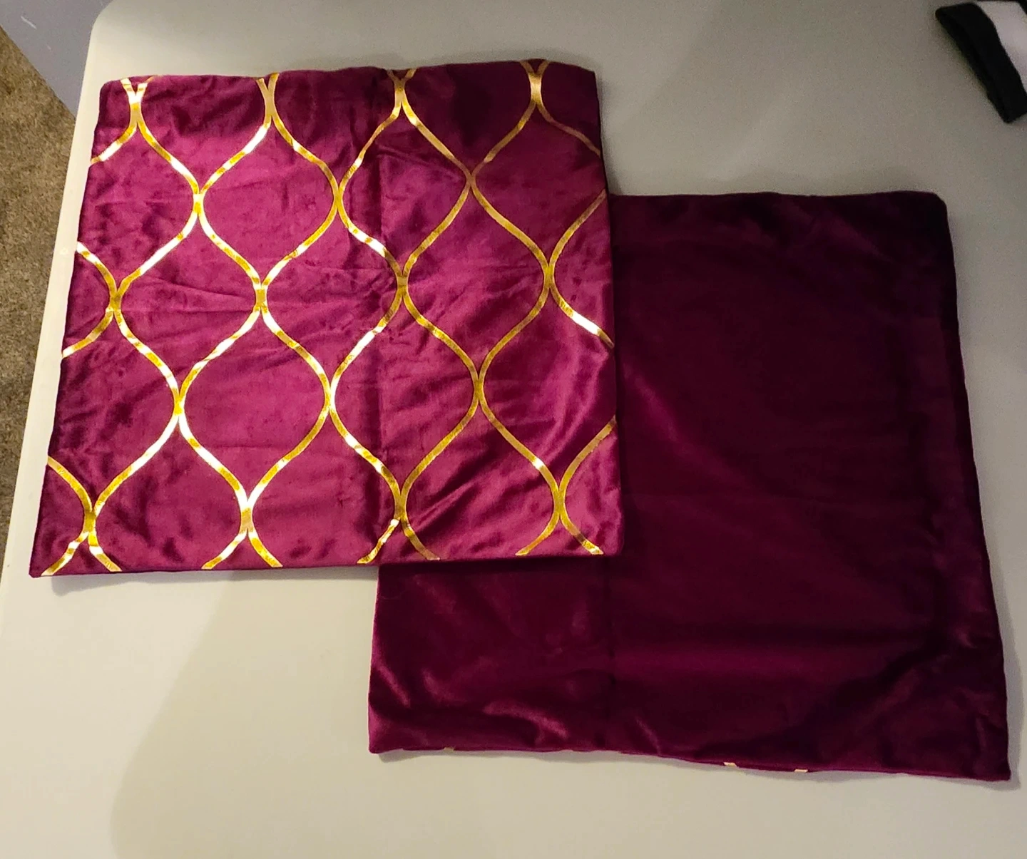 Add a touch of elegance to your home with these beautiful burgundy pillow covers featuring a gold pattern! It's perfect for adding a pop of colour and style to any room. The cover is in great condition and ready to brighten up your space