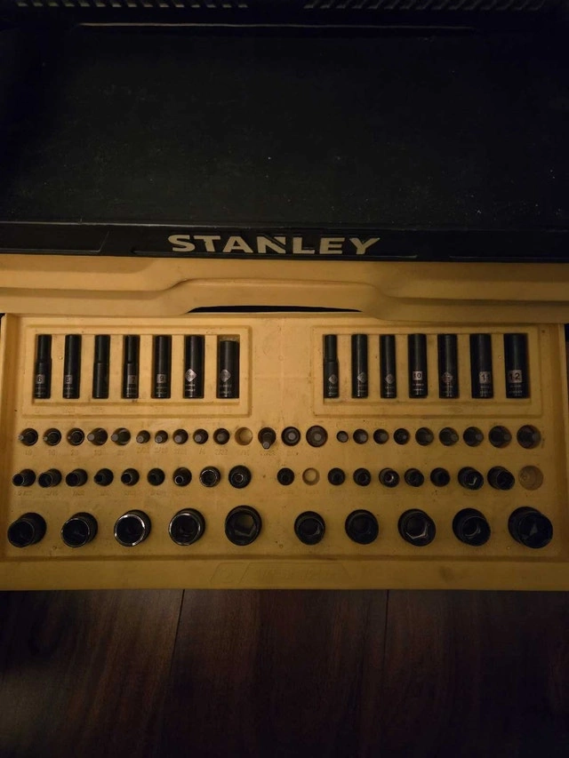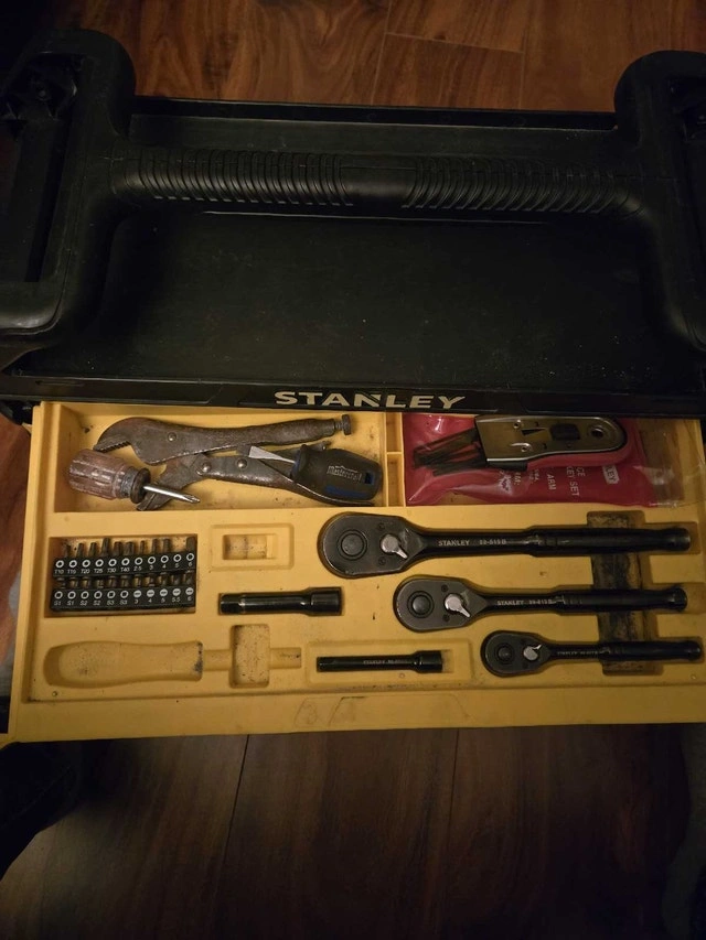 I'm selling a used Stanley tool box complete with a comprehensive set of tools. This set is perfect for both professional tradespeople and DIY enthusiasts looking for a reliable and sturdy tool storage solution. This item is in used condition, so please take this into consideration when making your purchase. Here are some details: