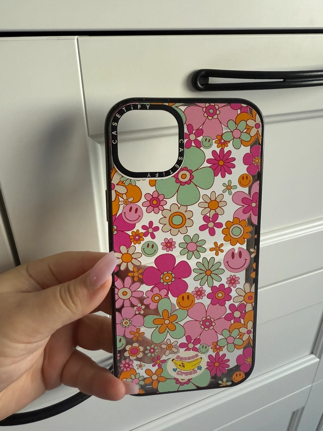 Selling a Casetify iPhone case with a cute floral and smiley face design! It's called Banana Crush and features pink, green, and orange flowers. Perfect for adding a pop of colour to your phone