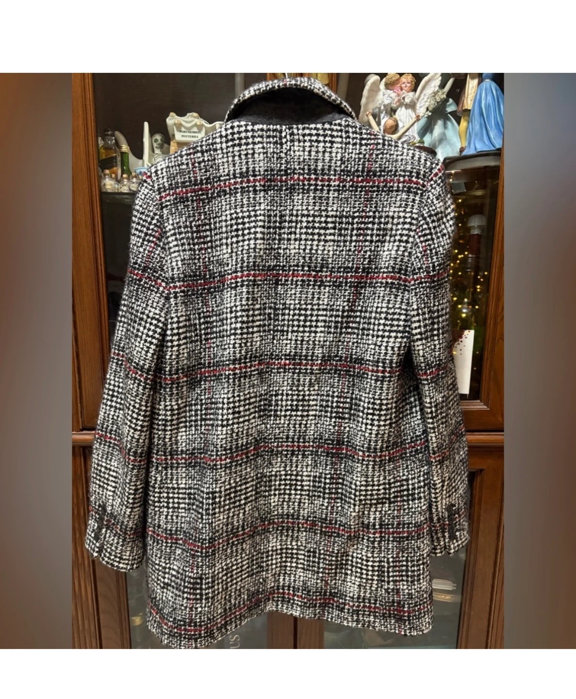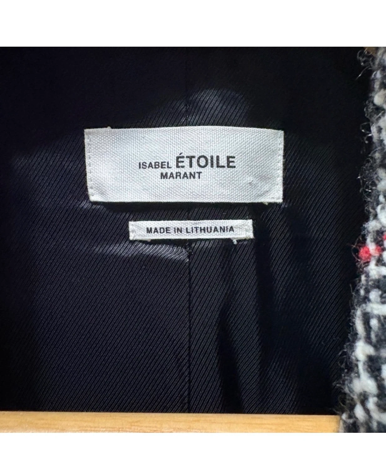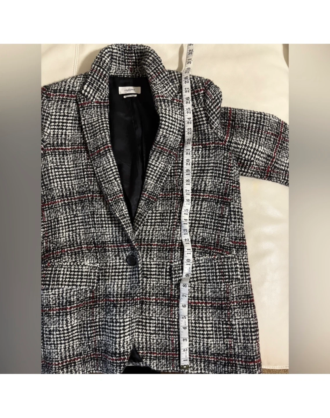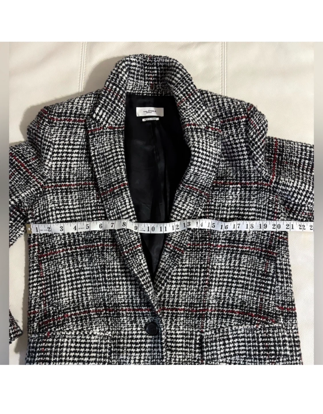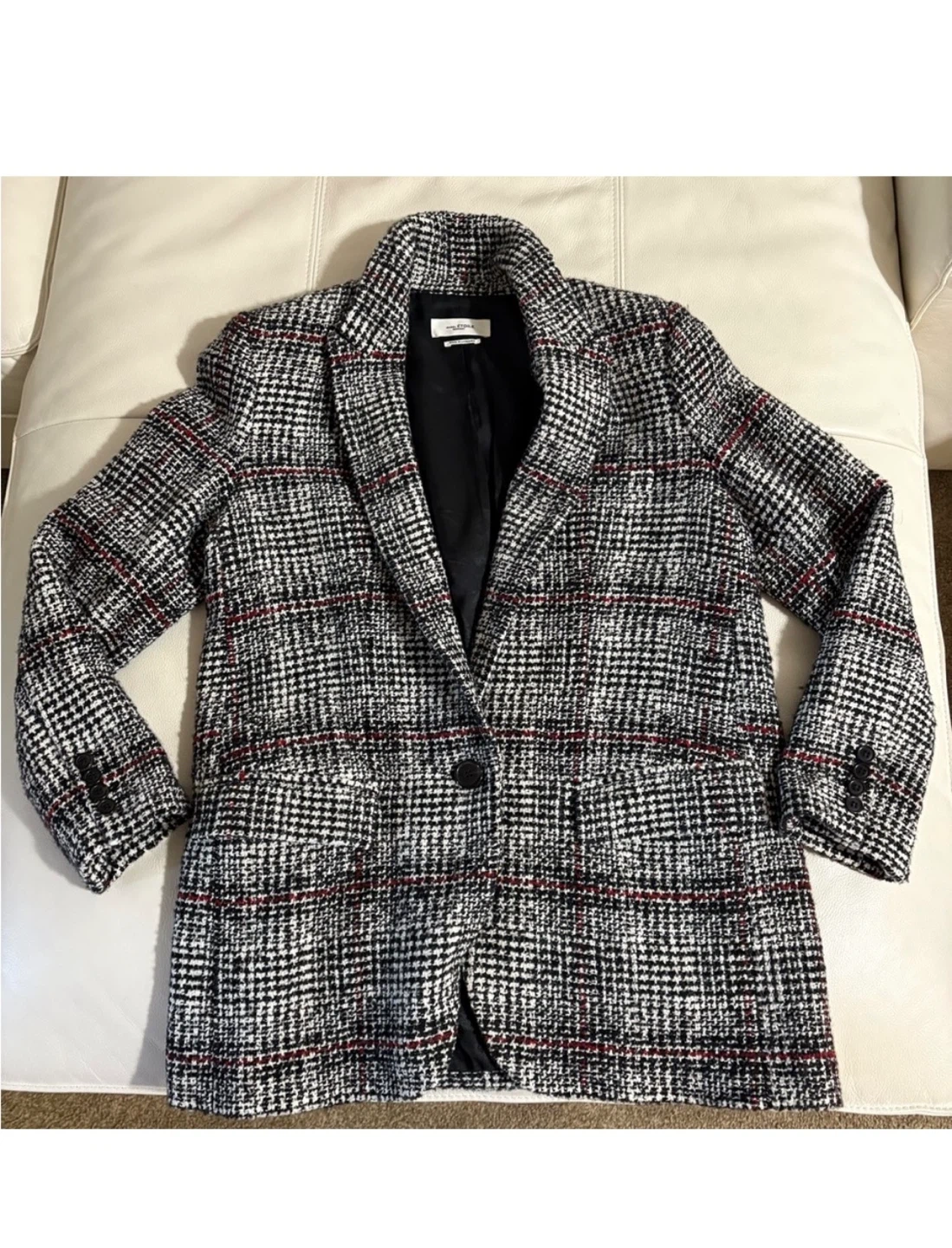 Selling an Isabel Etoile Marant blazer. It features a stylish black and white plaid pattern with subtle red accents. Perfect for adding a touch of sophistication to any outfit