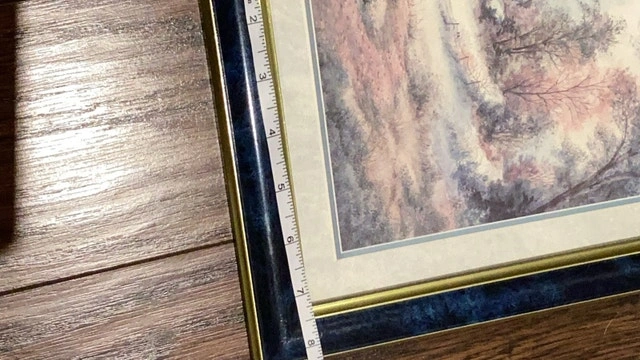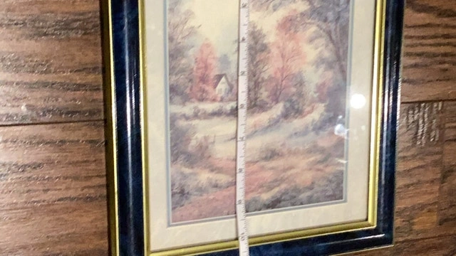 This framed painting features a serene landscape with soft, muted tones, perfect for adding a touch of pastoral charm to your space. The frame is a complementary blue with gold trim, enhancing the artwork's appeal. Being a previously loved piece, it carries a history and character all its own. Here are some details: