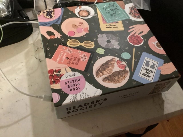 This delightful Reader's Society 1000-piece puzzle is perfect for book lovers and puzzle enthusiasts alike, featuring charming illustrations of literary-themed treats and scenes. The puzzle is in used, but good condition, ready to provide hours of engaging fun. Unfortunately, I don't have the exact dimensions or artist information available. If the ad is up, the puzzle is available.