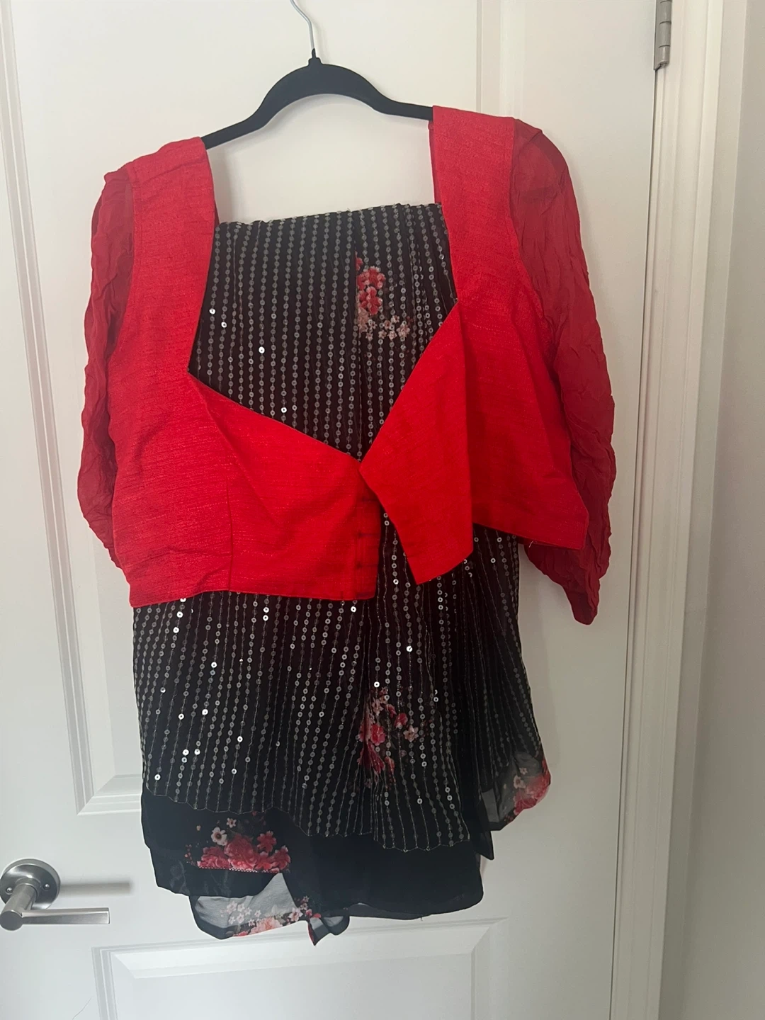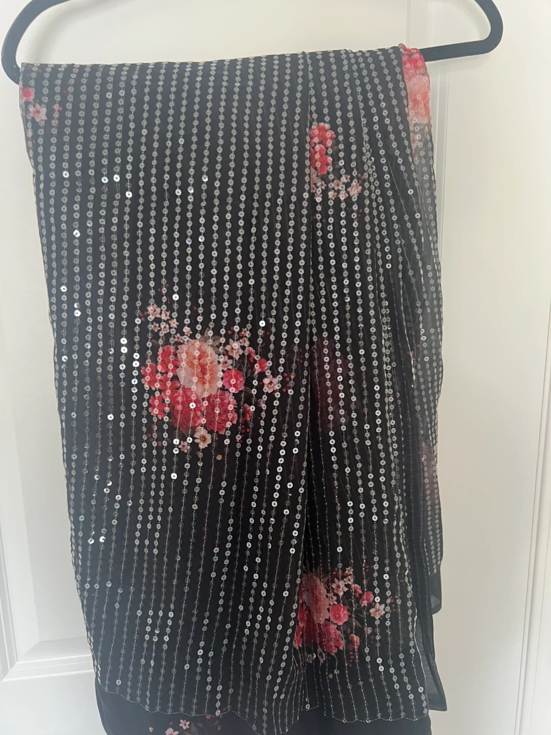 Beautiful saree featuring a striking black base adorned with delicate floral patterns and shimmering sequins. The set includes a coordinating red blouse to complete the look. Perfect for special occasions or adding a touch of elegance to your wardrobe