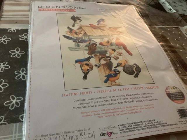 I'm offering a brand new Dimensions Needlecrafts 'Feasting Frenzy' counted cross stitch kit. This kit features a delightful bird-themed design and includes everything you need to create a beautiful piece of needlework art. I am including: pre-sorted thread, 18 count Ivory Aida, needle and instructions.