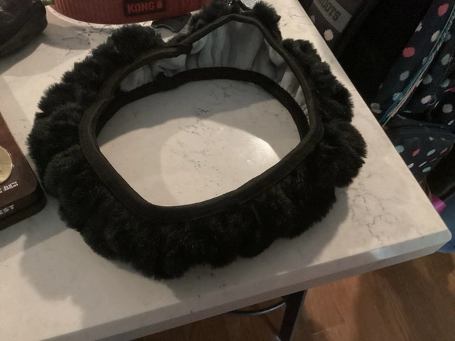 This stylish, black faux fur hand wheel cover is designed to add a touch of luxury and comfort to your driving experience. Being previously enjoyed, this cover is in good condition and ready to give your steering wheel a makeover! Add a bit of flair to your everyday drive!