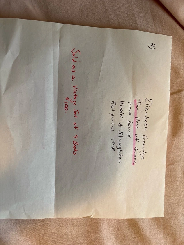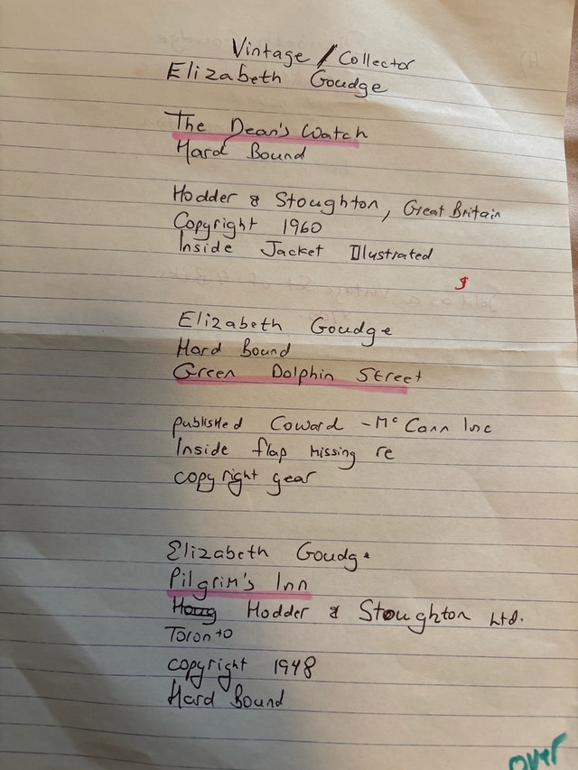 Own a piece of literary history with this set of Elizabeth Goudge hardcovers! This collection includes 'The Dean's Watch' (Copyright 1960), 'Green Dolphin Street', 'Pilgrim's Inn' (Copyright 1948), and 'The Herb of Grace' (First printed 1948). All books are in good condition considering their age. *Note: 'Green Dolphin Street' has a missing inside flap. They're waiting for a new home on your bookshelf! If the ad is up, they're available!