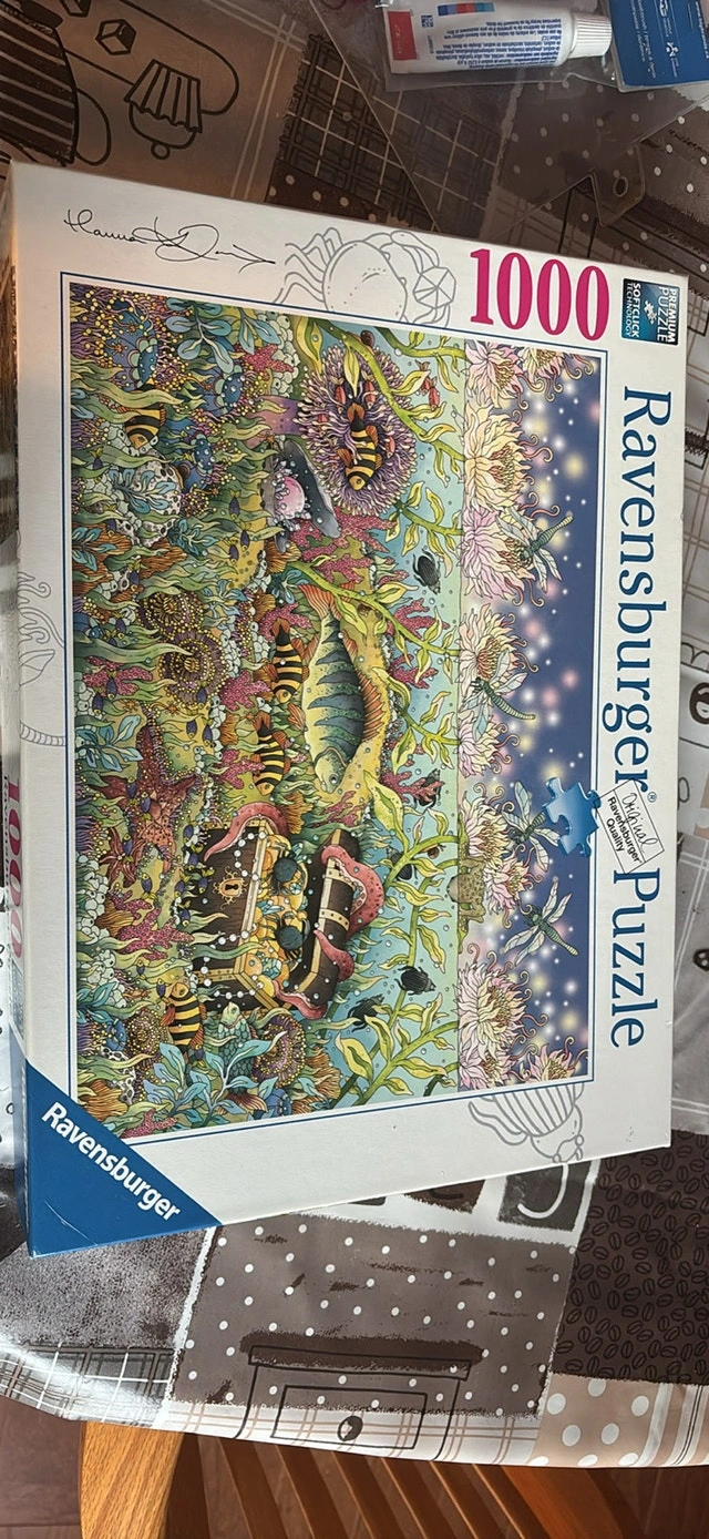 Dive into an underwater adventure with this Ravensburger 1000-piece jigsaw puzzle! The image boasts vibrant colours and intricate details of a fantastical sea scene. This puzzle is in used condition, ready to bring hours of fun to its next home. Puzzles are like a box of chocolates, you never know what you're gonna get. If the ad's still up, the puzzle's still available!