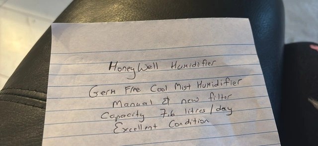 I'm selling a Honeywell Germ Free Cool Mist Humidifier with a 7.6 litre capacity per day that's in excellent condition. Included is the manual and a new filter to keep everything running smoothly. * Germ Free * Cool Mist * 7.6 Litre Capacity * Includes Manual * Includes New Filter I'm asking $40 for this item. It's priced to sell quickly! If you're reading this, it's available, ready to bring moisture and comfort to your space!
