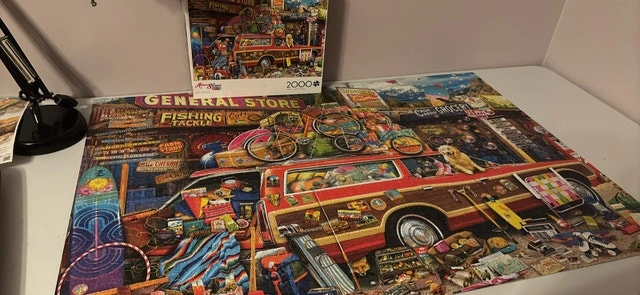 Dive into a world of intricate details with this Aimee Stewart 2000-piece jigsaw puzzle! This puzzle is pre-owned but in great condition, promising hours of engaging entertainment. It is complete. The picture features a Woody filled with an assortment of items. It's a vibrant and challenging puzzle that is sure to captivate any puzzle enthusiast. * Artist: Aimee Stewart * Number of Pieces: 2000 * Theme: Woody with general store and grocery contents. Looking at similar listings on Kijiji, a fair price for this puzzle is $20.00. Don't miss out on the chance to own this delightful puzzle. If the ad is up, yes, it's still available!
