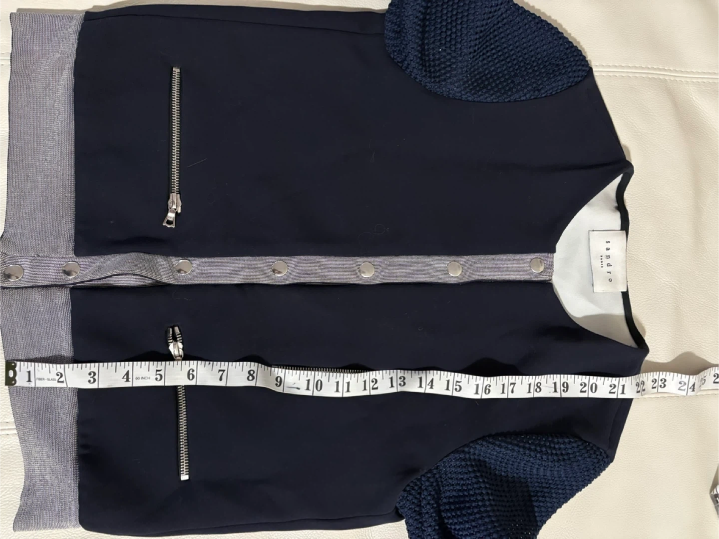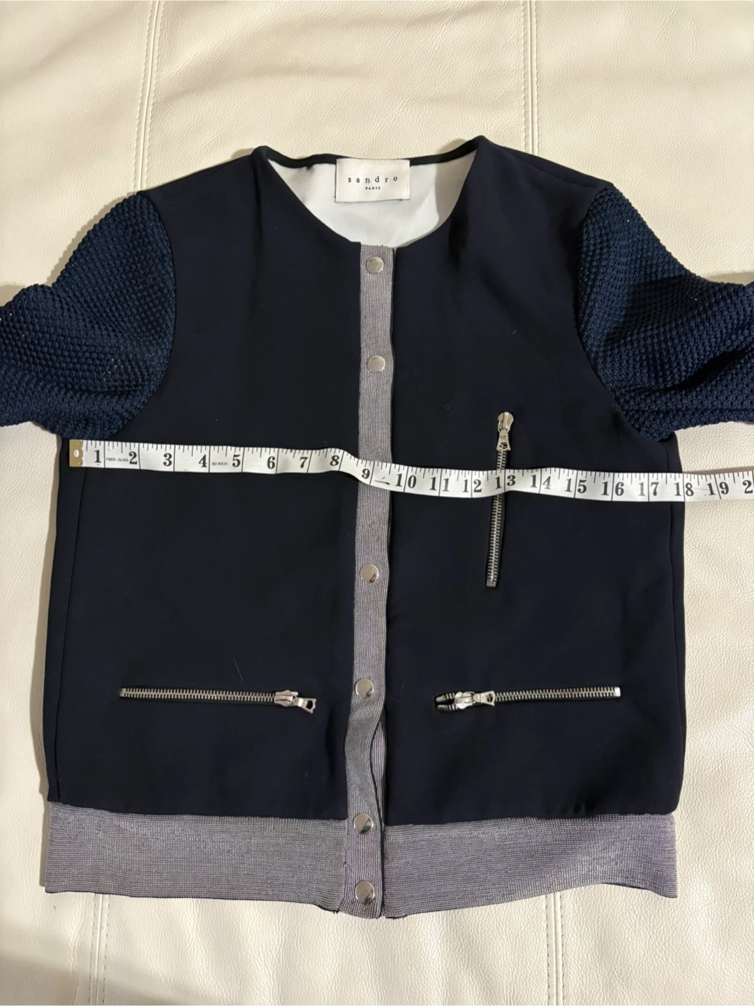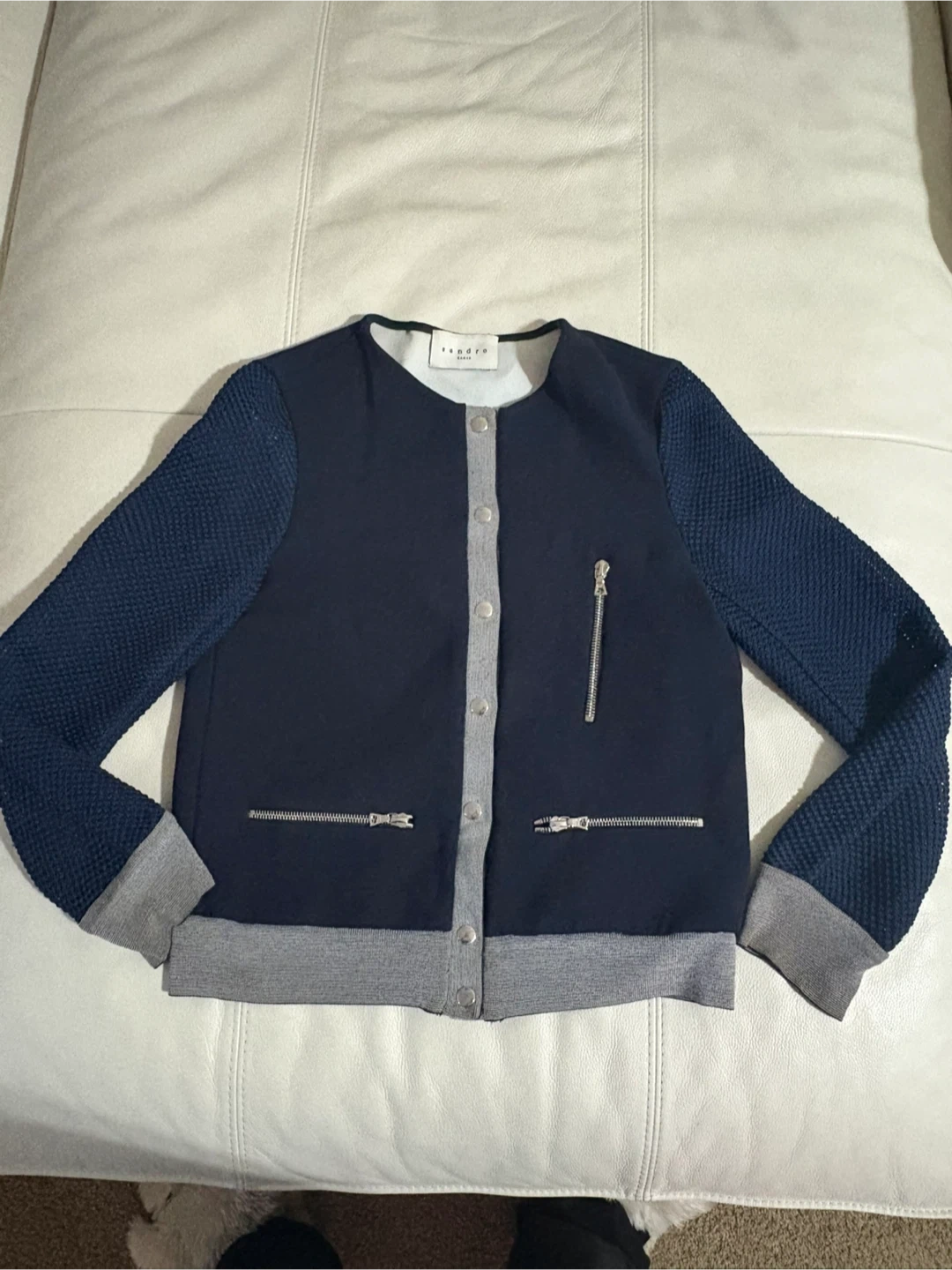 Selling a Sandro Paris cardigan in navy blue. It features mesh sleeves and silver zipper accents, giving it a unique touch. It measures approximately 17 inches across the chest when buttoned up. A stylish addition to any wardrobe!