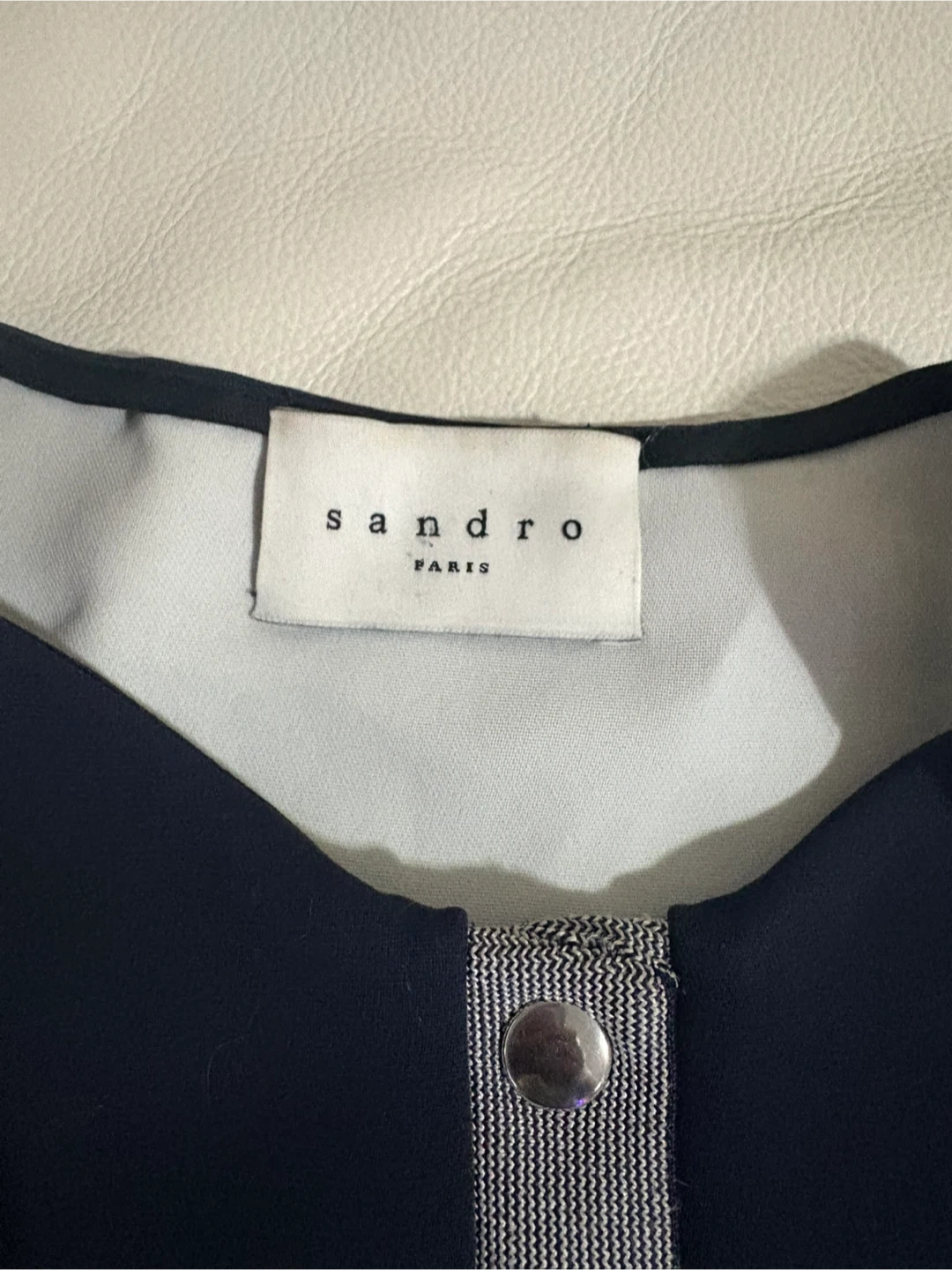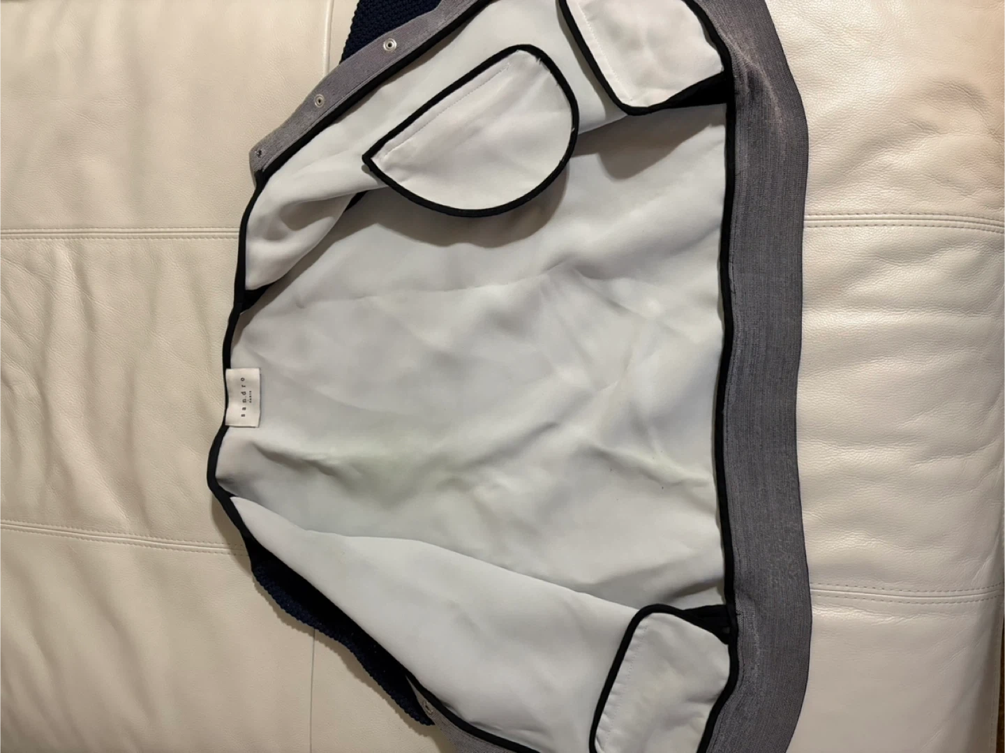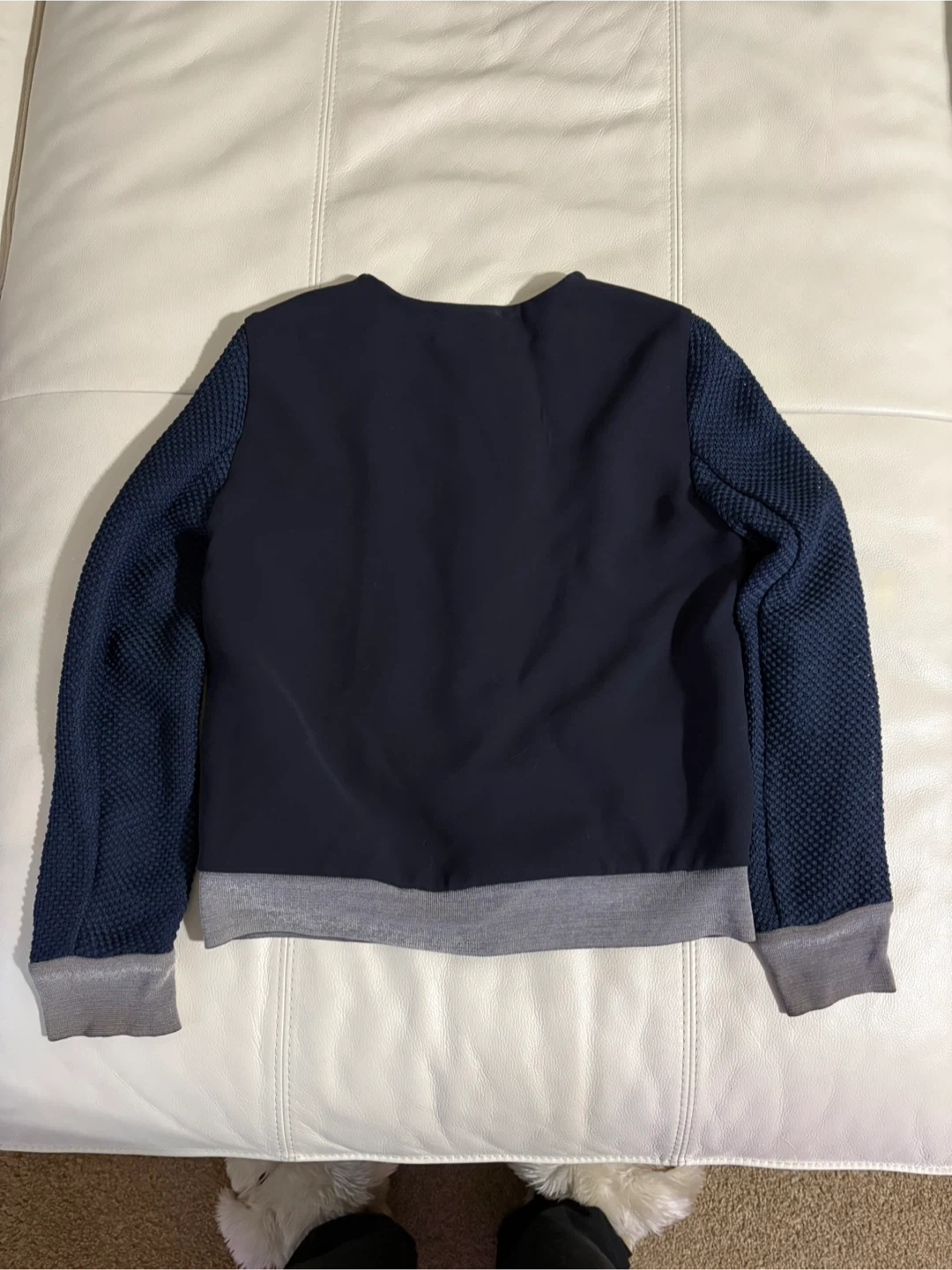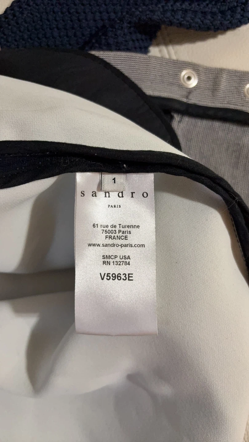 Selling a Sandro Paris cardigan in navy blue. It features mesh sleeves and silver zipper accents, giving it a unique touch. It measures approximately 17 inches across the chest when buttoned up. A stylish addition to any wardrobe!