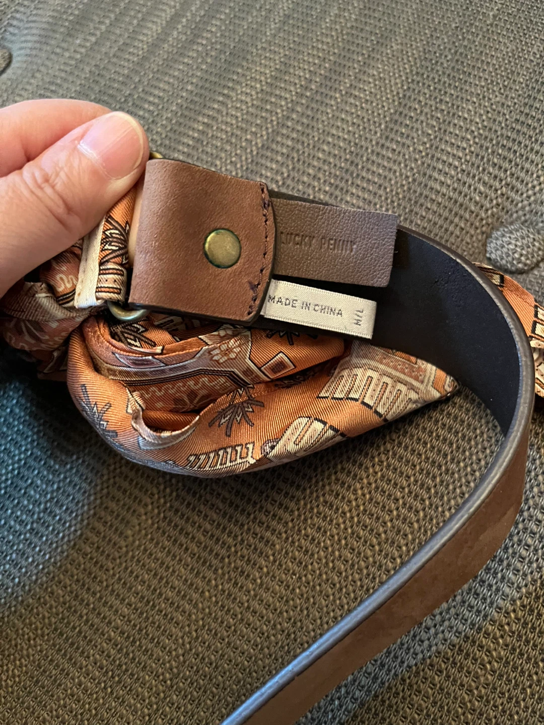 Selling a stylish Lucky Penny belt that adds a unique touch to any outfit! This belt features a beautiful scarf detail. The size is M/L