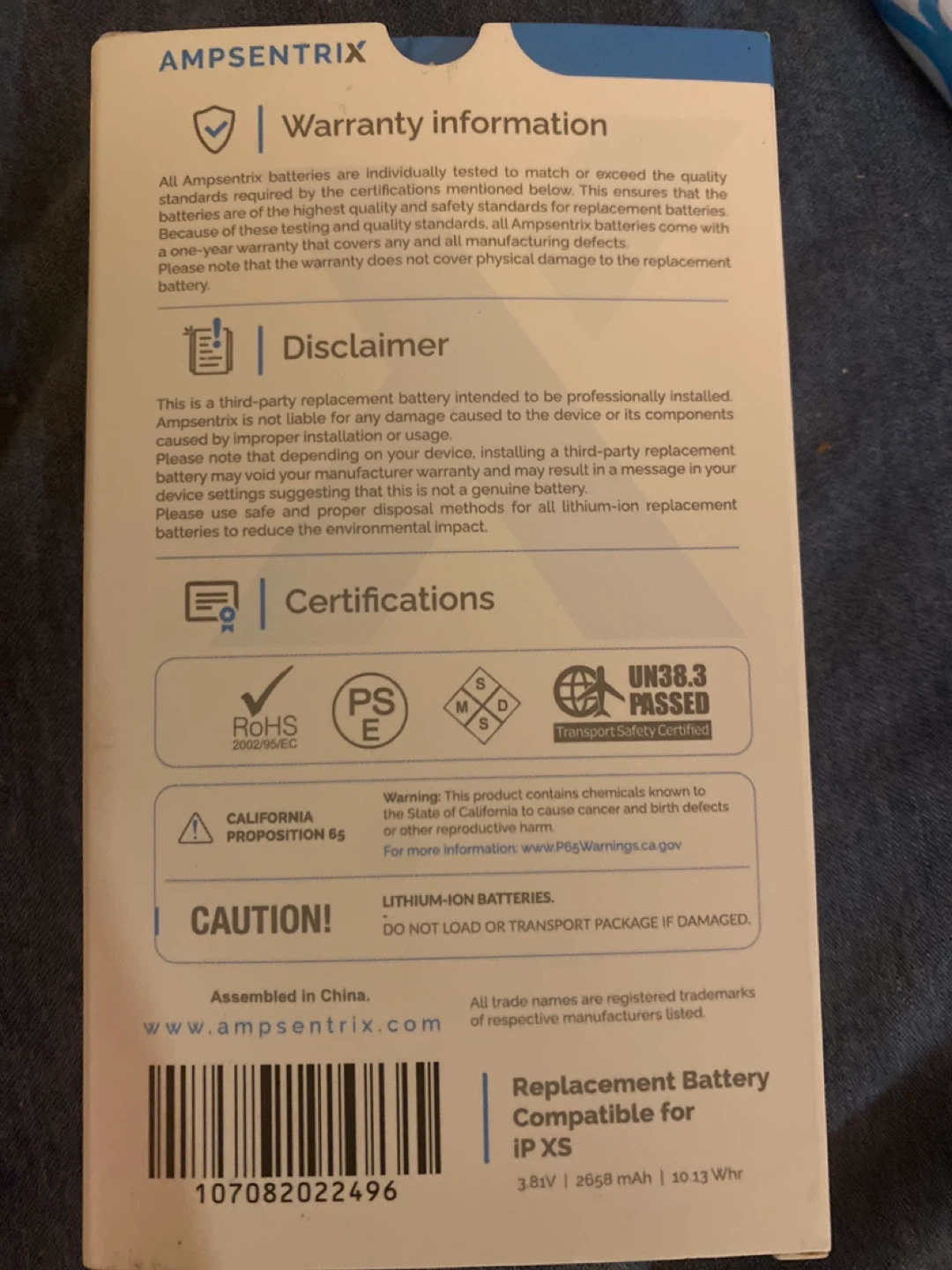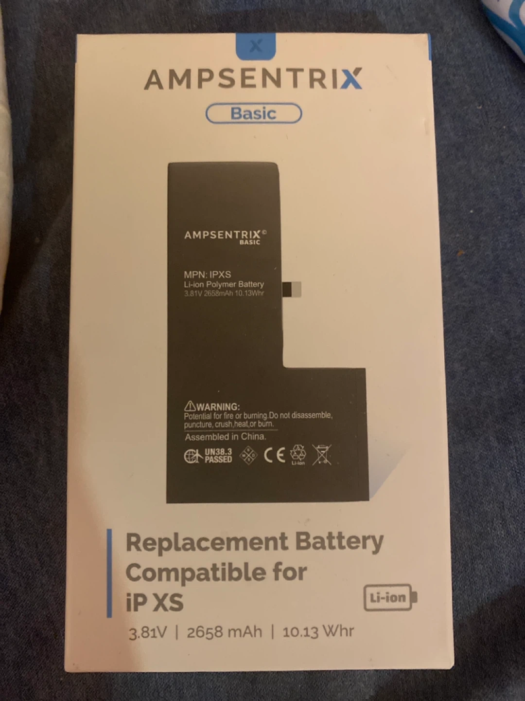 Selling a brand new Ampsentrix replacement battery compatible with the iPhone XS. It's a Li-ion polymer battery with 3.81V, 2658 mAh, and 10.13 Whr. The box includes warranty information and certifications. Perfect for replacing your old battery!
