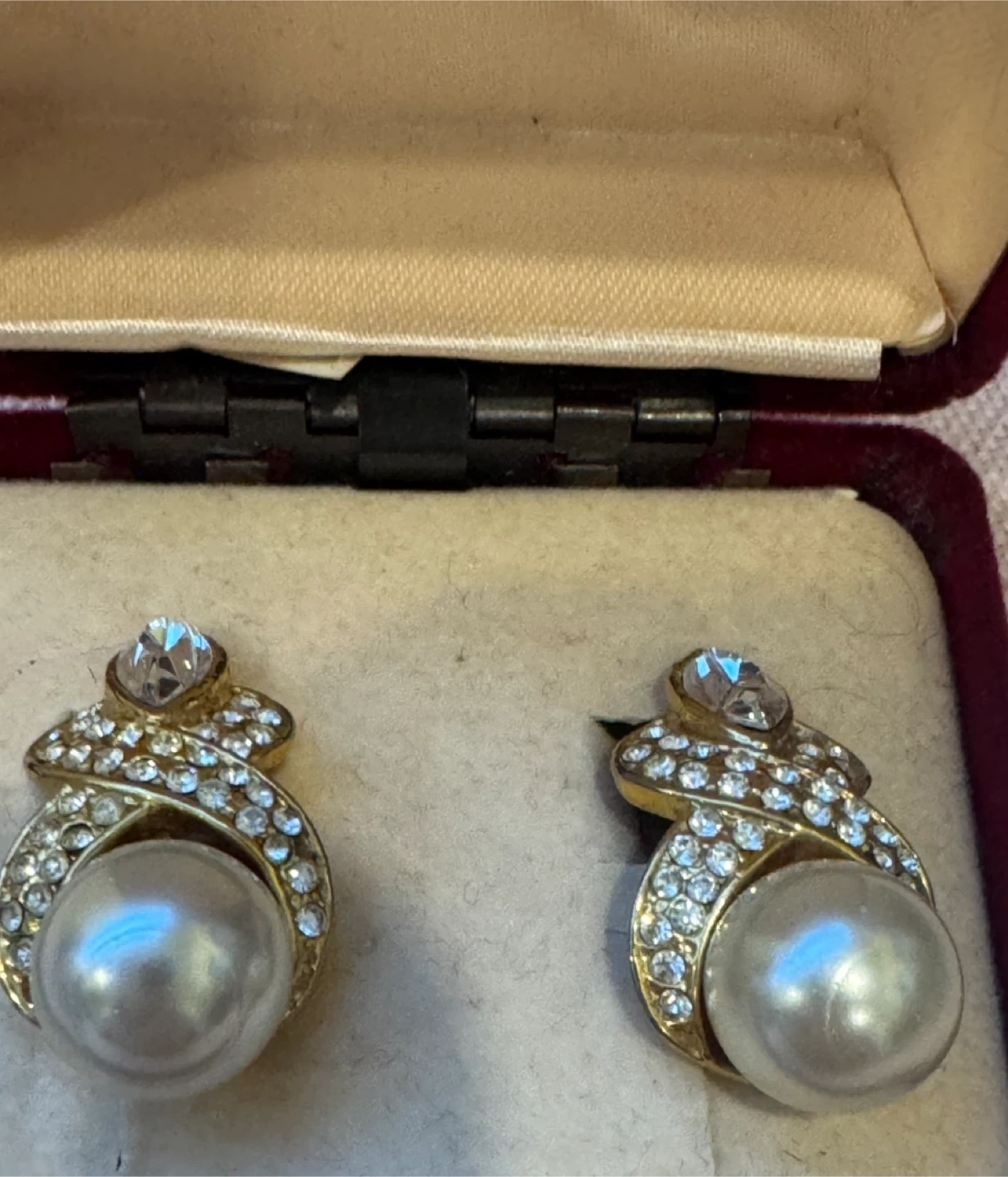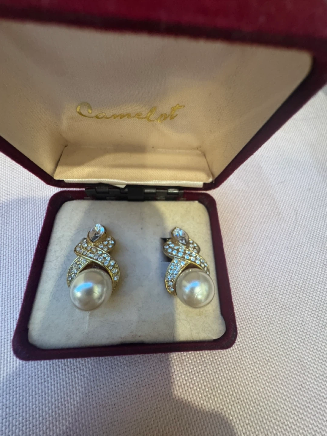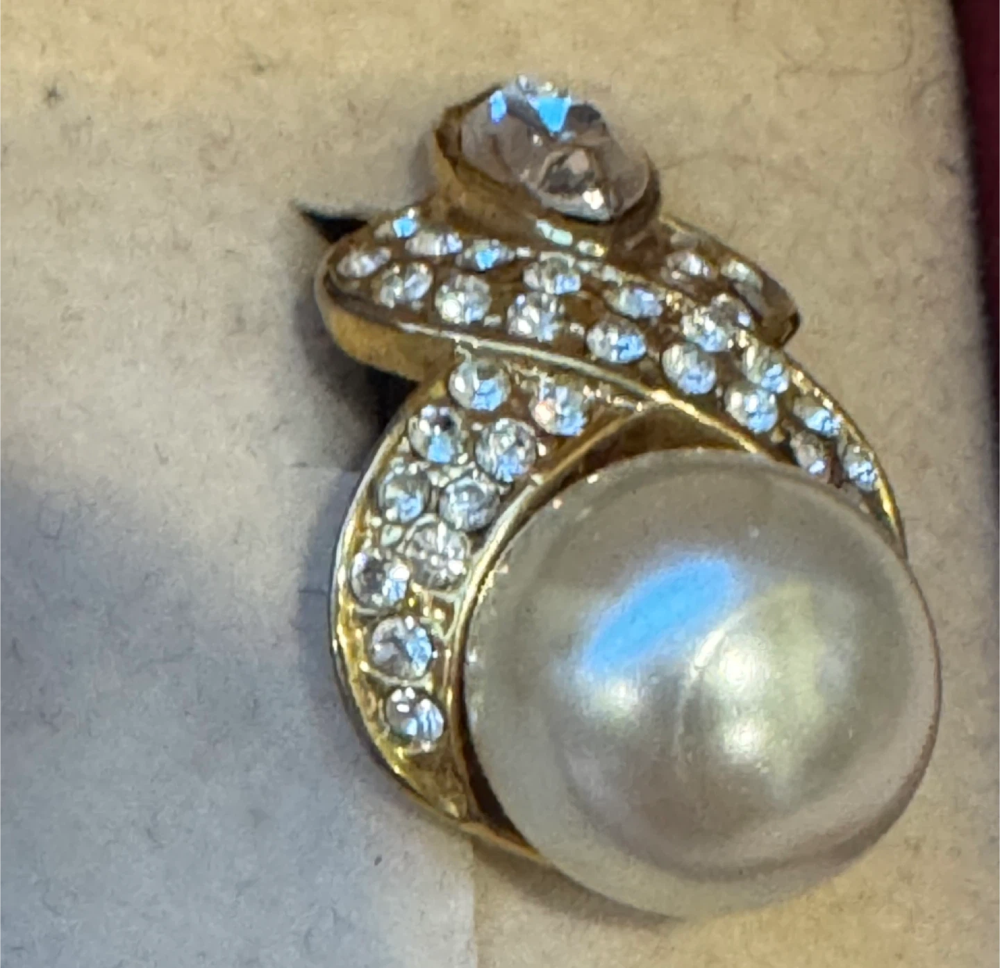 These Camelot earrings feature a beautiful design with pearls and rhinestones. These are a pair of vintage-style gold-tone clip-on earrings with large faux pearls and clear rhinestones, consistent with costume jewelry from possibly the mid-to-late 20th century. The design features a swirling or ribbon-like metal setting, pavé-set with small crystals and topped with a larger single rhinestone, which cradles a prominent, round faux pearl at the base.