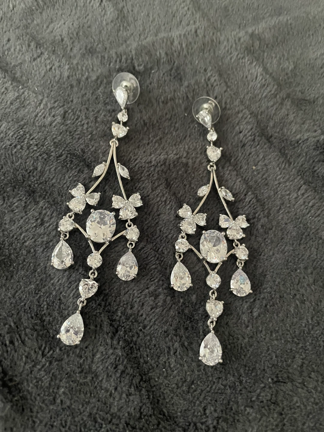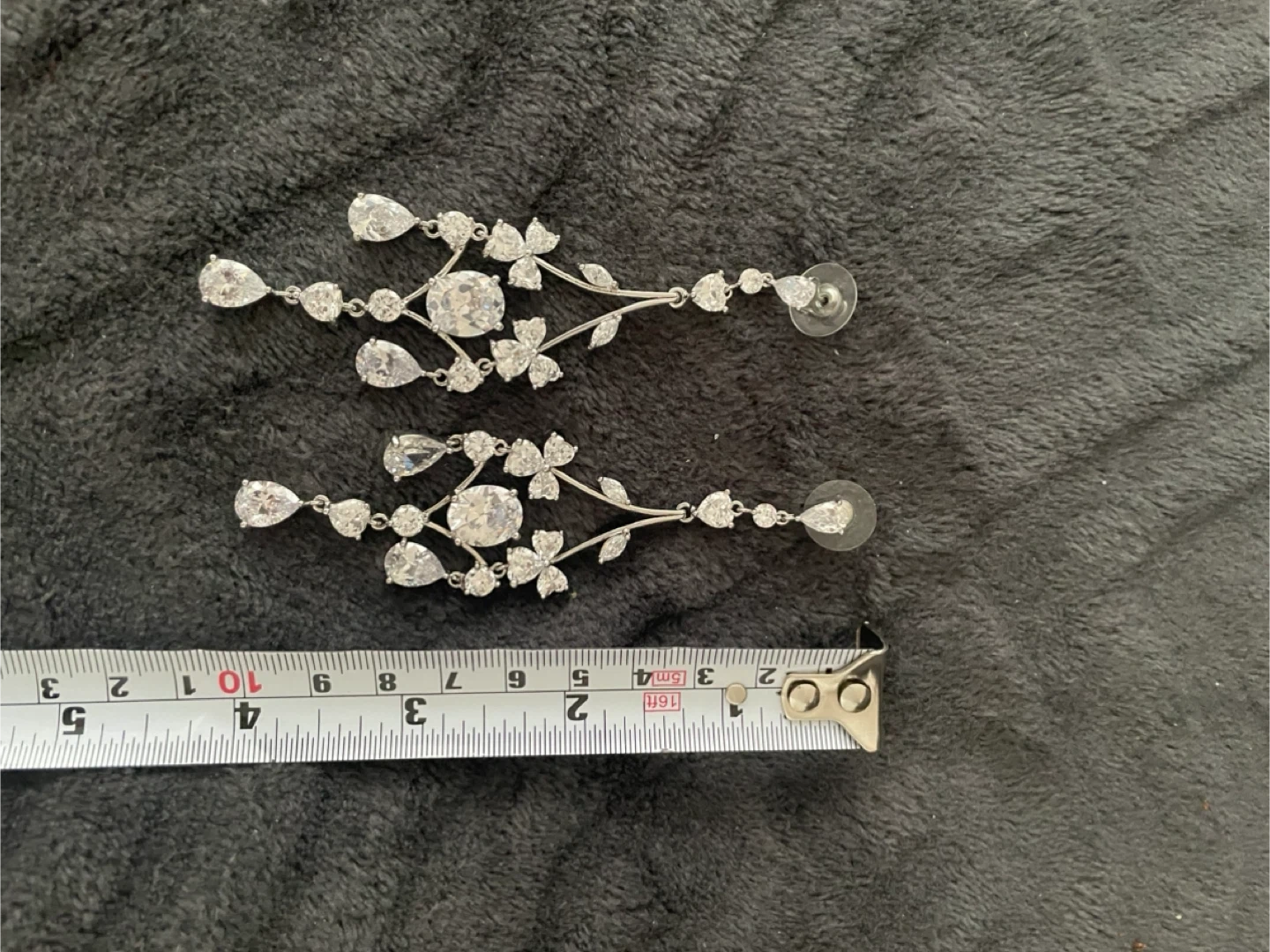 Selling a pair of beautiful silver-toned dangle earrings. They feature a floral design with teardrop and round crystals. Perfect for adding a touch of sparkle to any outfit!