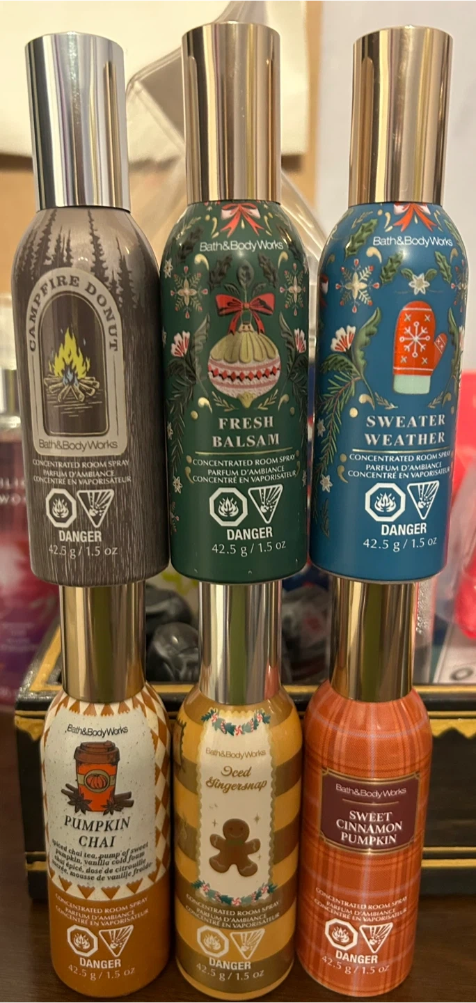 I have a few Bath & Body Works concentrated room sprays up for grabs! Scents include Campfire Donut, Fresh Balsam, Sweater Weather, Pumpkin Chai, Iced Gingersnap, and Sweet Cinnamon Pumpkin. All are 42.5 g / 1.5 oz