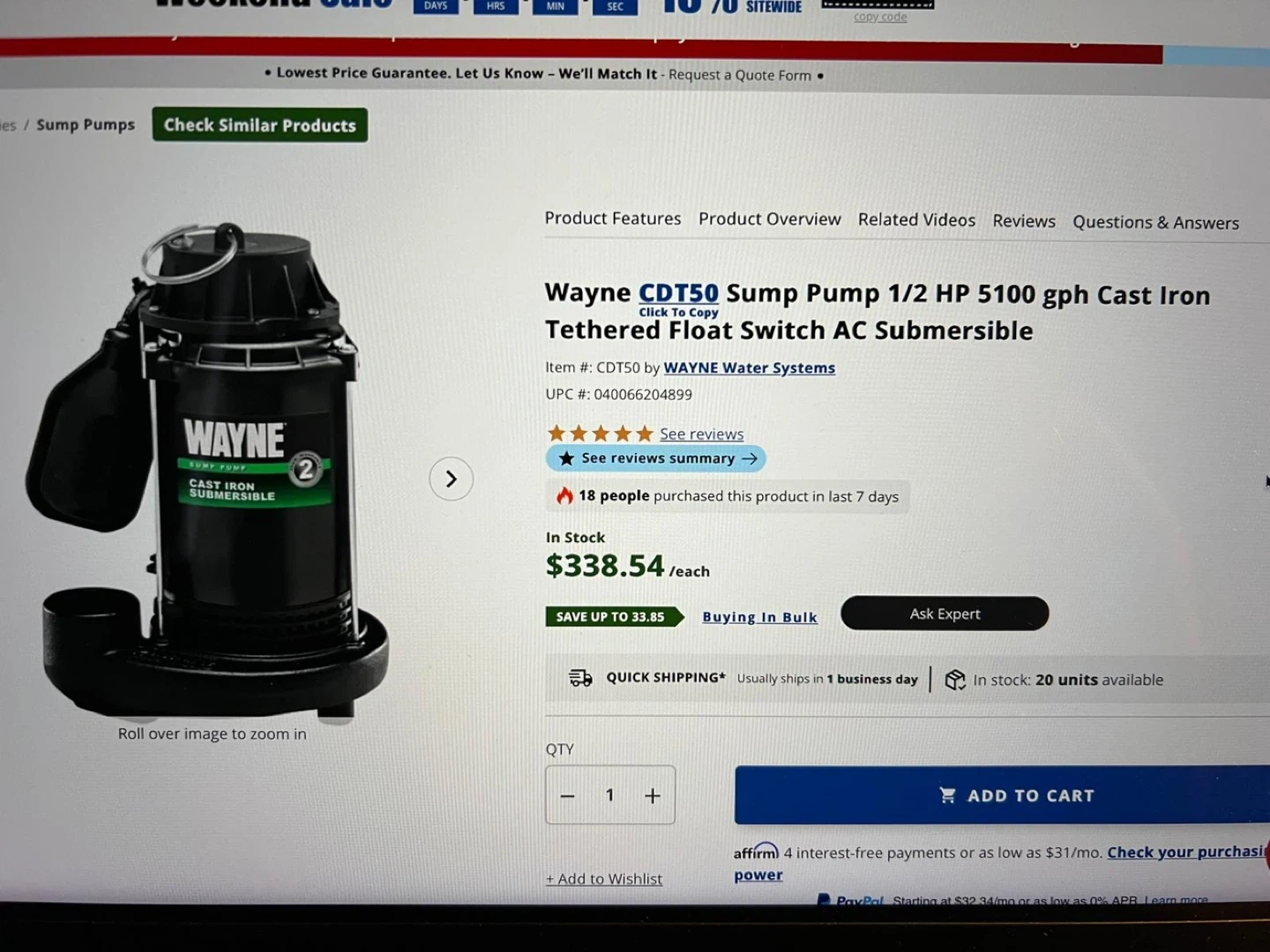 Selling a Wayne CDT50 Sump Pump in excellent condition! This heavy-duty pump is ready to keep your basement dry. The original box is included, along with the quick start manual. Originally bought for $338.54, it's a great deal for reliable performance!