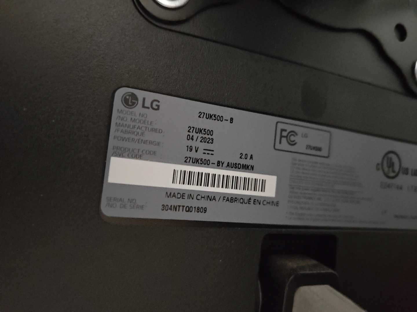 Selling an LG 27UK500-B monitor! It's a 27-inch 4K display. Manufactured in April 2023. It requires 19V and 2.0A for power. Perfect for work or gaming!
