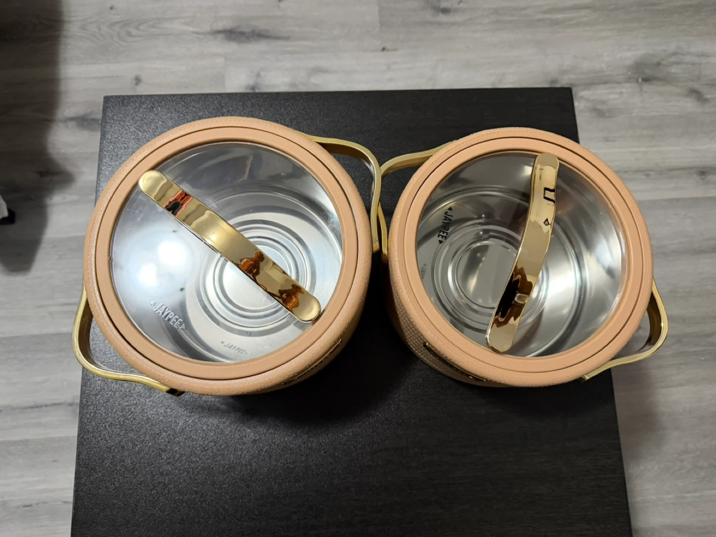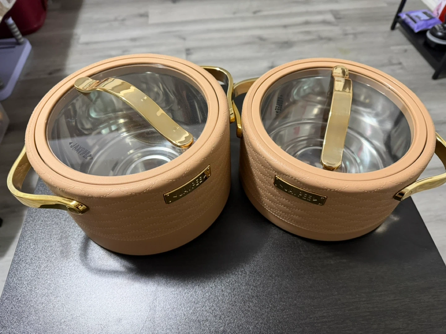 Selling a set of never used two Jaypee insulated casseroles. They're in excellent condition and ready to keep your food warm! The exterior has a quilted texture and gold-tone accents, adding a touch of elegance to your kitchen or buffet table. Perfect for keeping dishes at the right temperature during gatherings or everyday meals