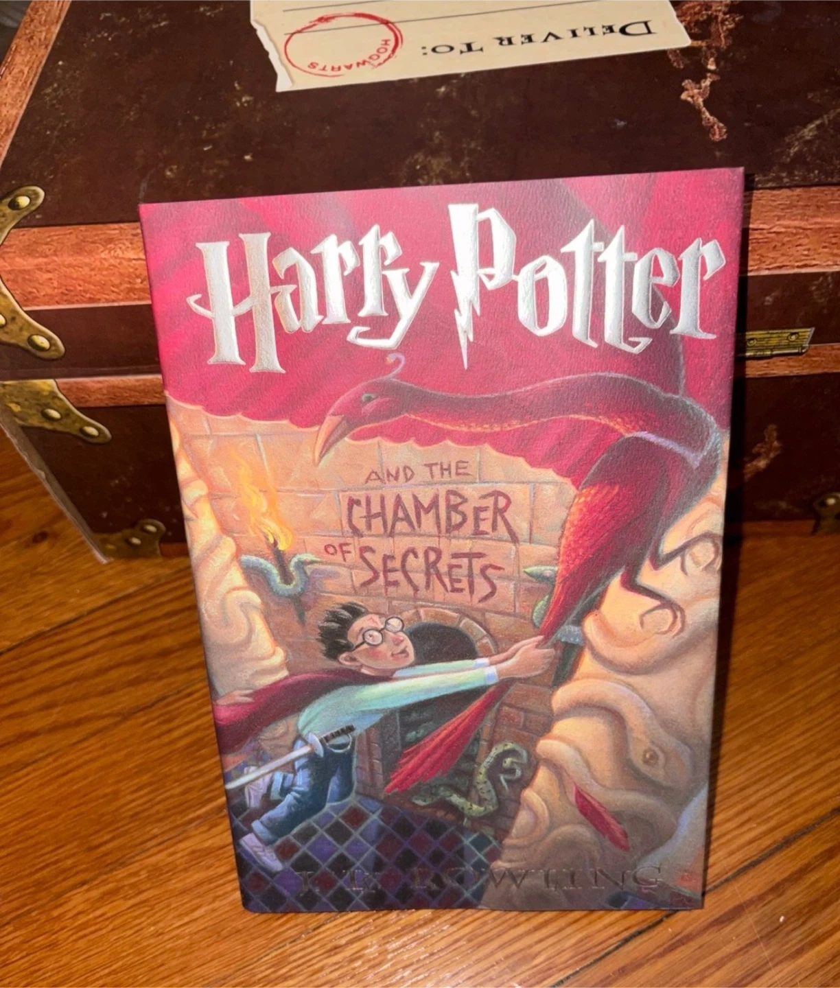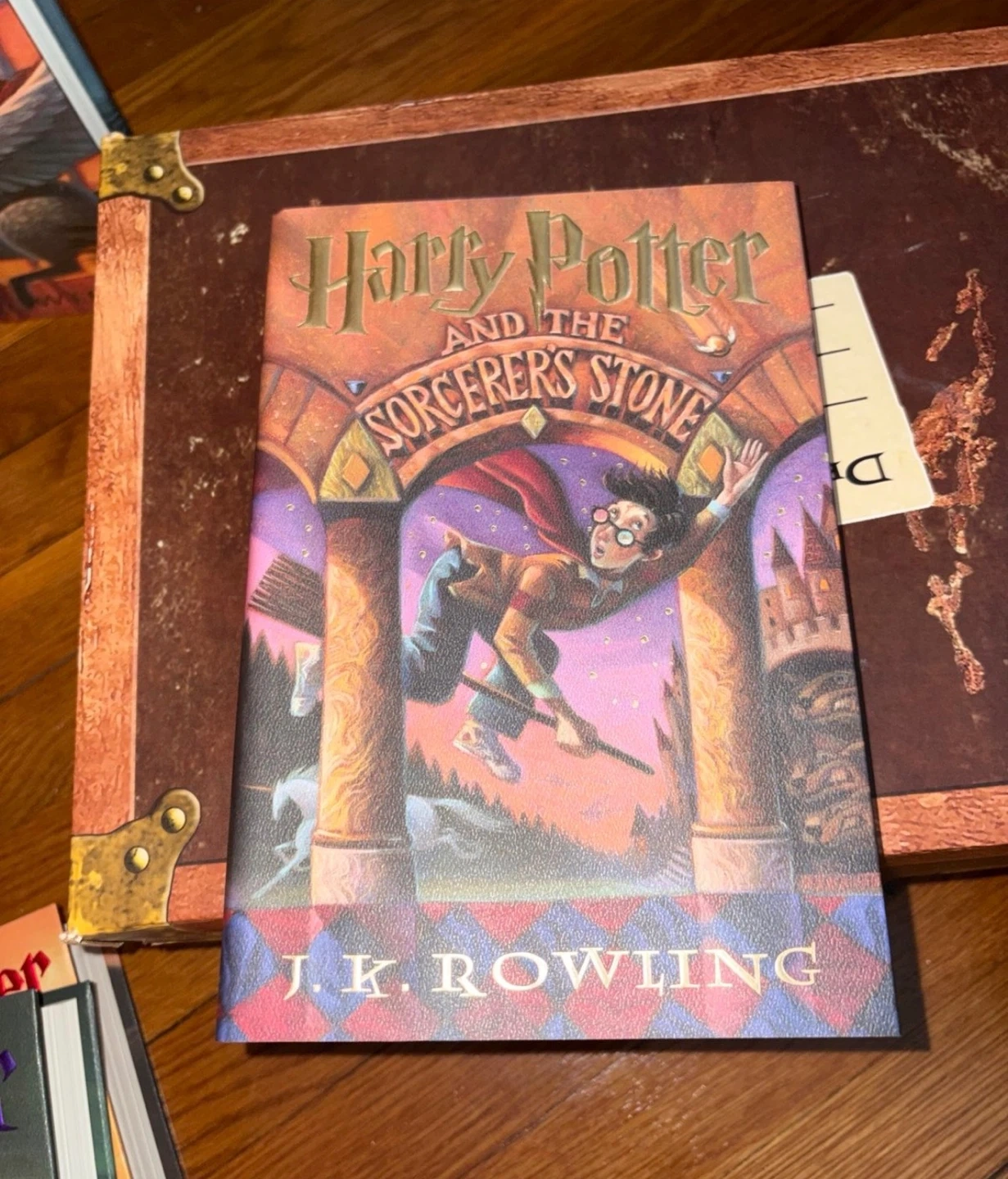 Harry Potter Boxed Set includes hardcover books 1-7 in a trunk chest, featuring various USA editions i.e. First Editions and First American Editions all from the USA. This collection by J.K. Rowling is signed by none, personalized by none, and intended for a wide audience, including young adults and adults. The books cover genres such as fantasy and magic, school and education, and mysteries and detective stories, offering a captivating narrative in a beautifully presented format. Perfect for fans of the series or as a gift for any book lover, this set is a must-have for any Harry Potter enthusiast.