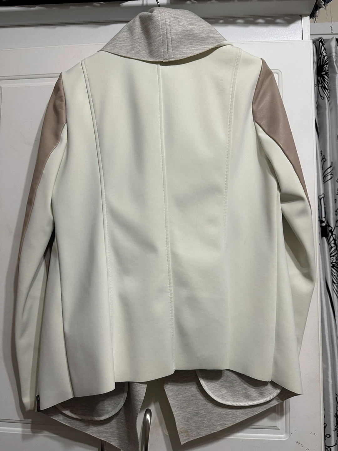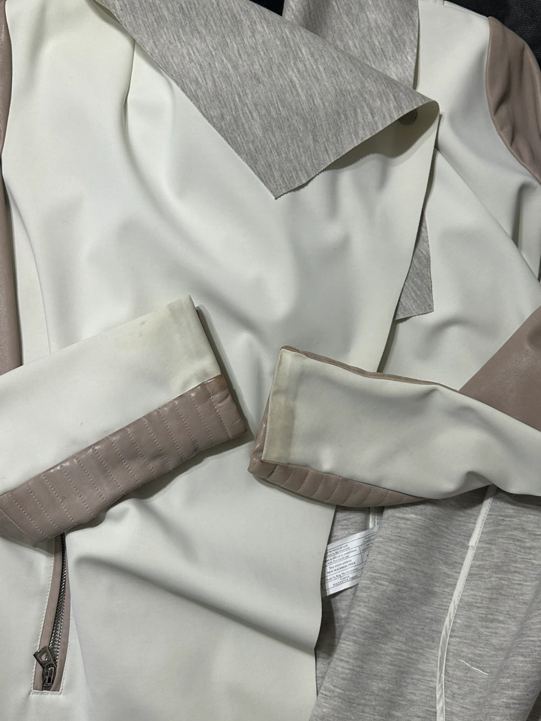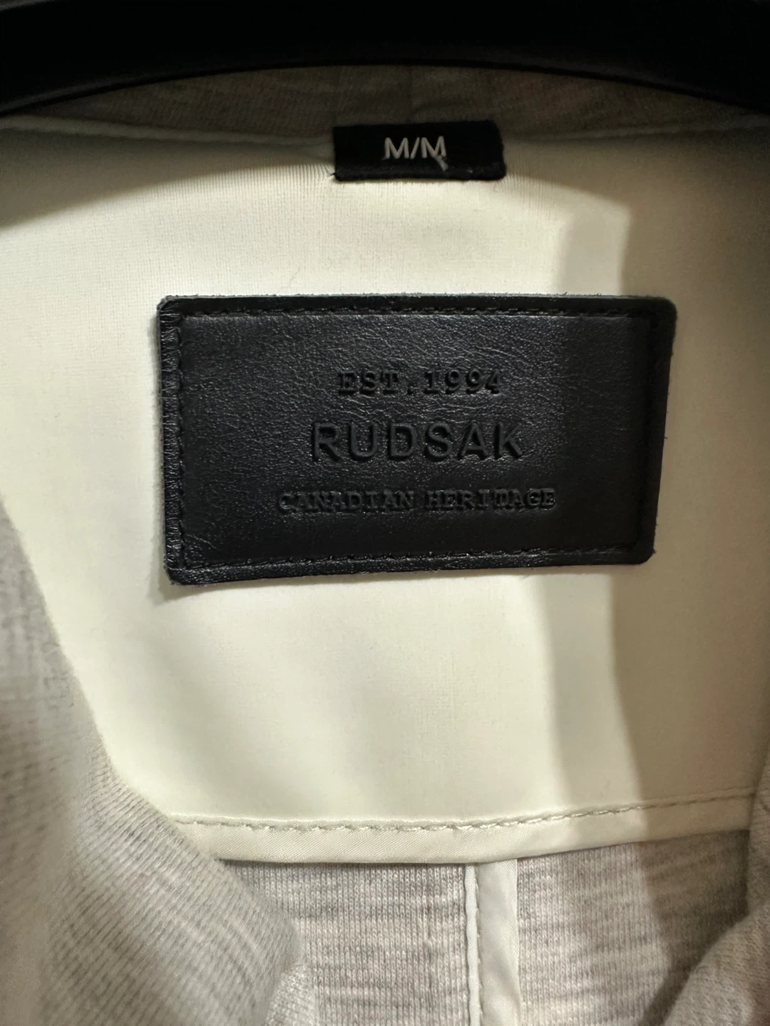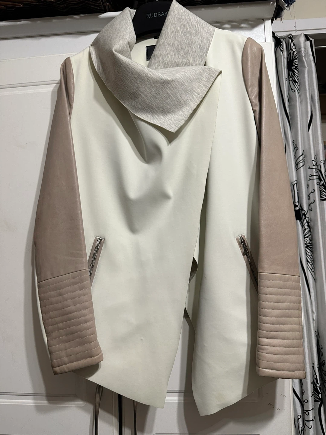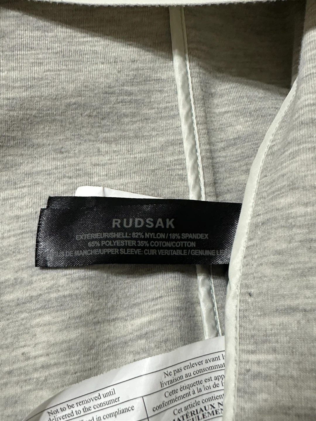 Rudsak jacket in size M. The exterior shell is made of 82% nylon and 18% spandex. The upper sleeve is made of genuine leather. There are some signs of wear.