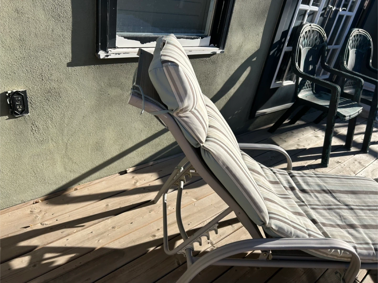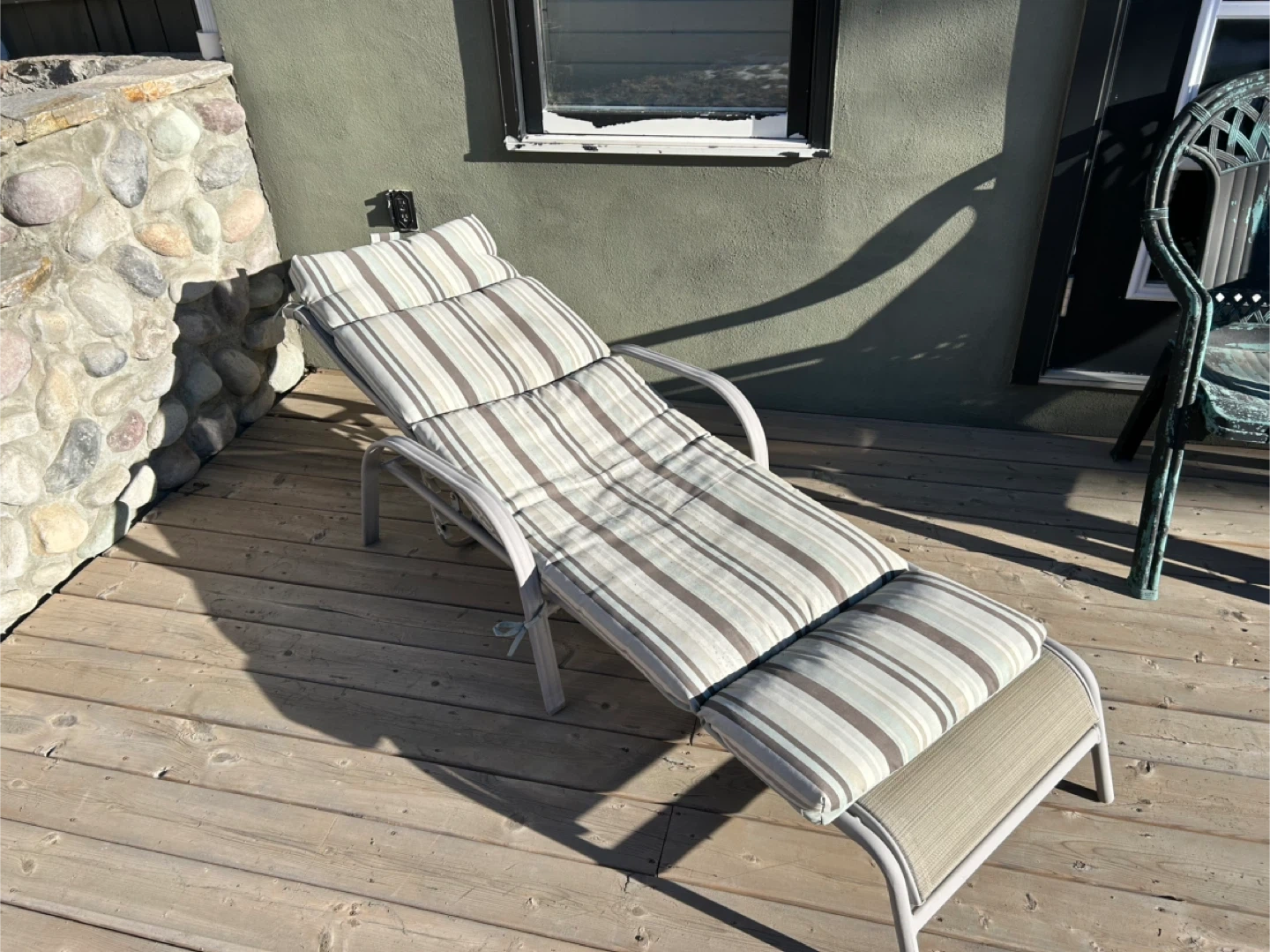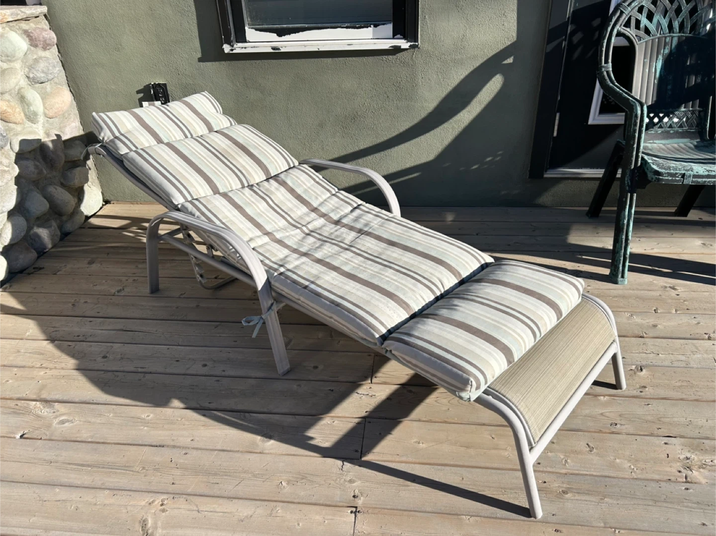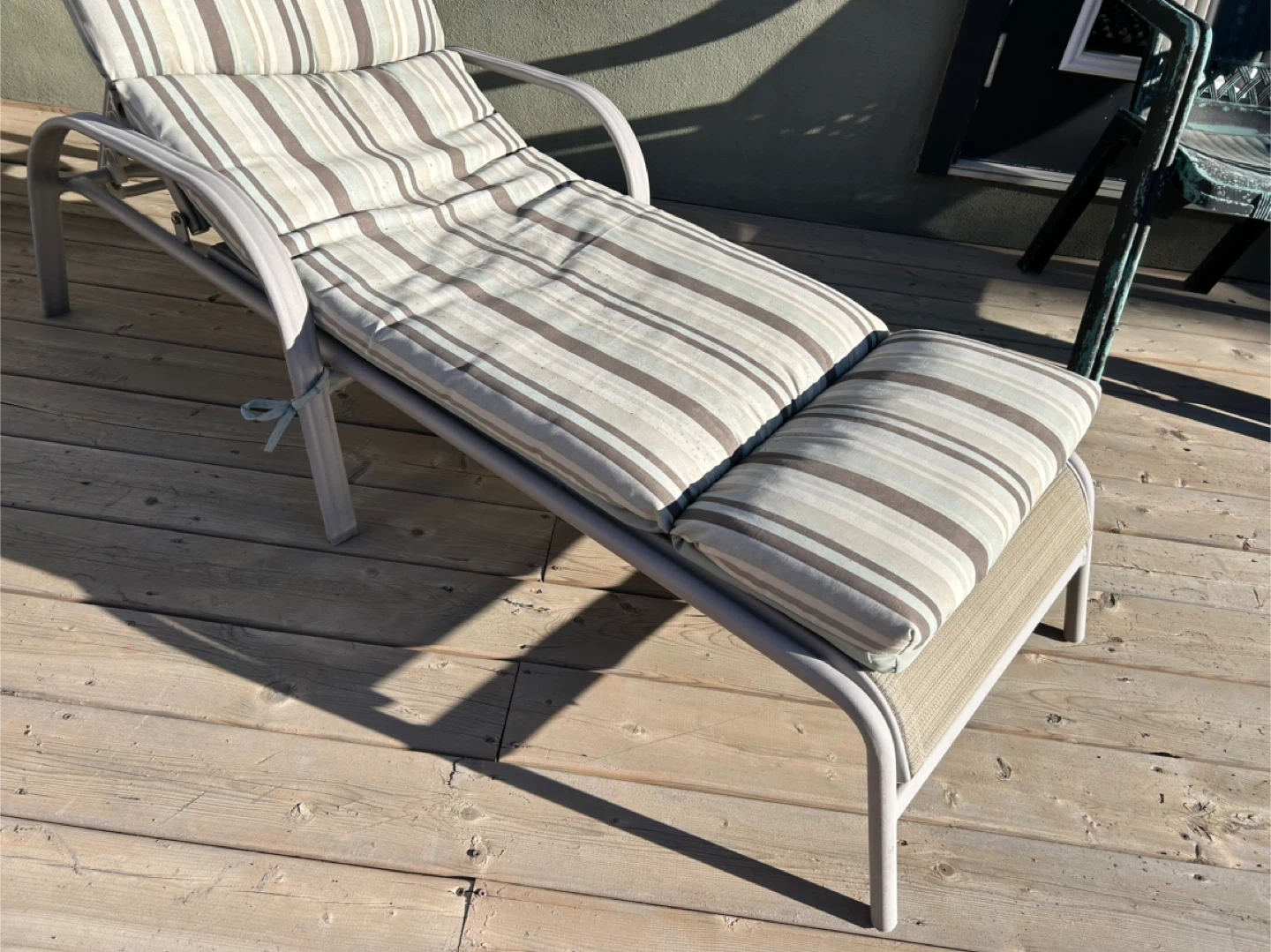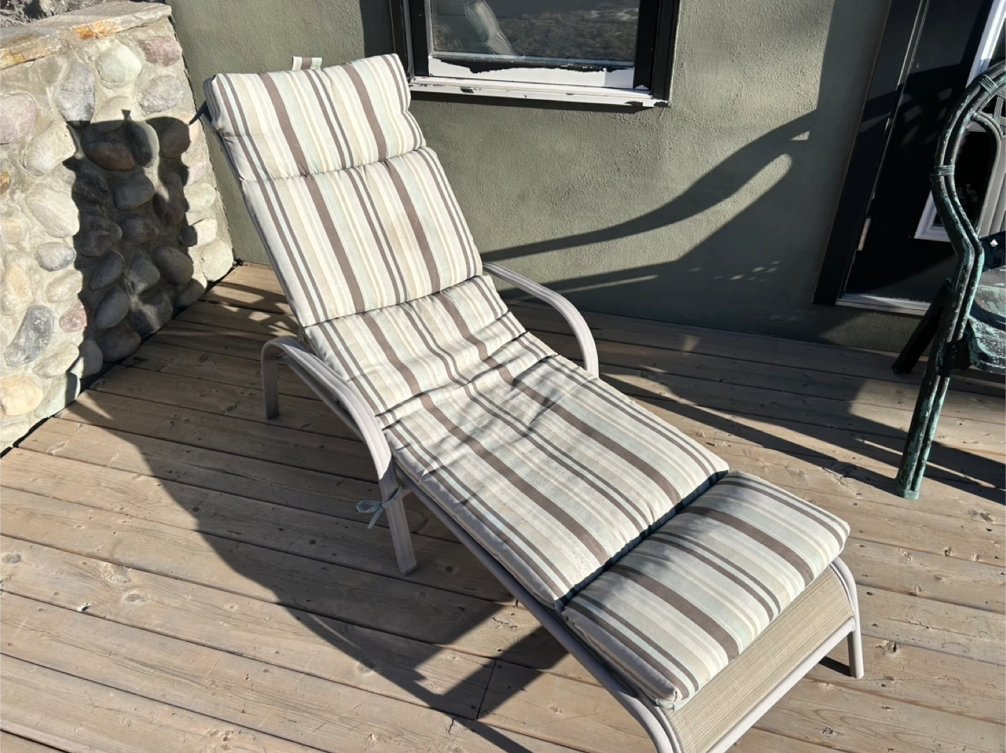 Outdoor chaise lounge chair with a comfortable striped cushion. It's perfect for relaxing on the deck or by the pool. The frame is sturdy and the cushion is in great shape. Ready for you to enjoy the summer sun!