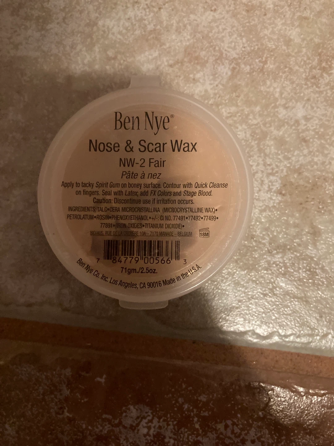 Selling a Ben Nye Nose & Scar Wax in NW-2 Fair. It's a pâte à nez, perfect for contouring with Spirit Gum and sealing with Latex and FX Colors. The container has 71gm/2.5oz of product
