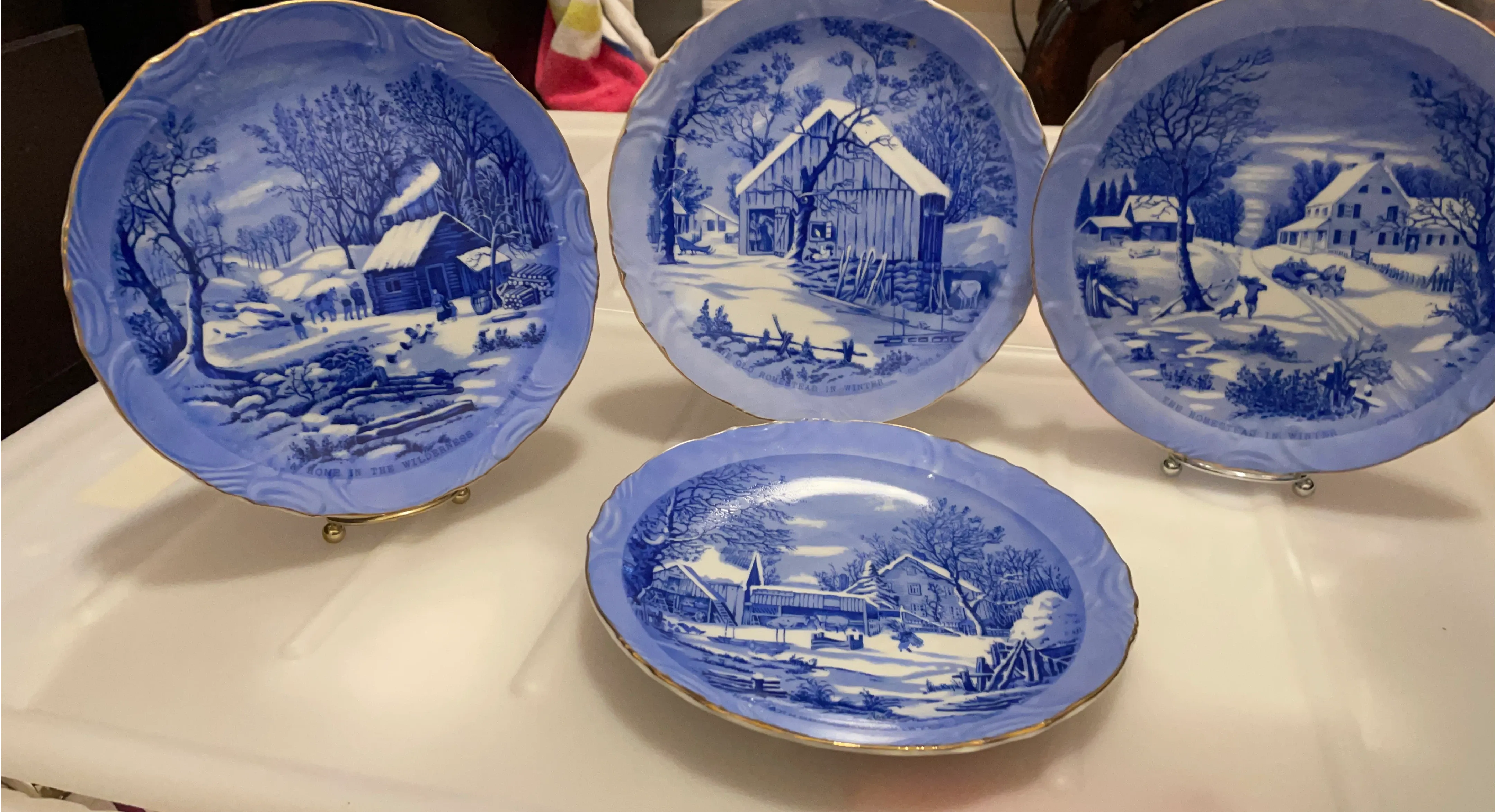Selling a set of four decorative plates featuring winter scenes. They have a lovely blue and white design with gold trim. Each plate depicts a different winter landscape, adding a touch of seasonal charm to your home. Great for display or as part of a collection!