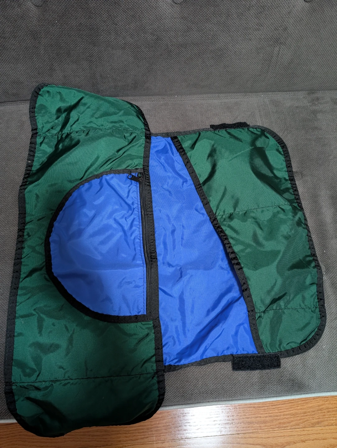 Selling a green and blue armrest organizer. It's in great condition and ready to use! It's perfect for storing your remotes, glasses and other things around your TV area.
