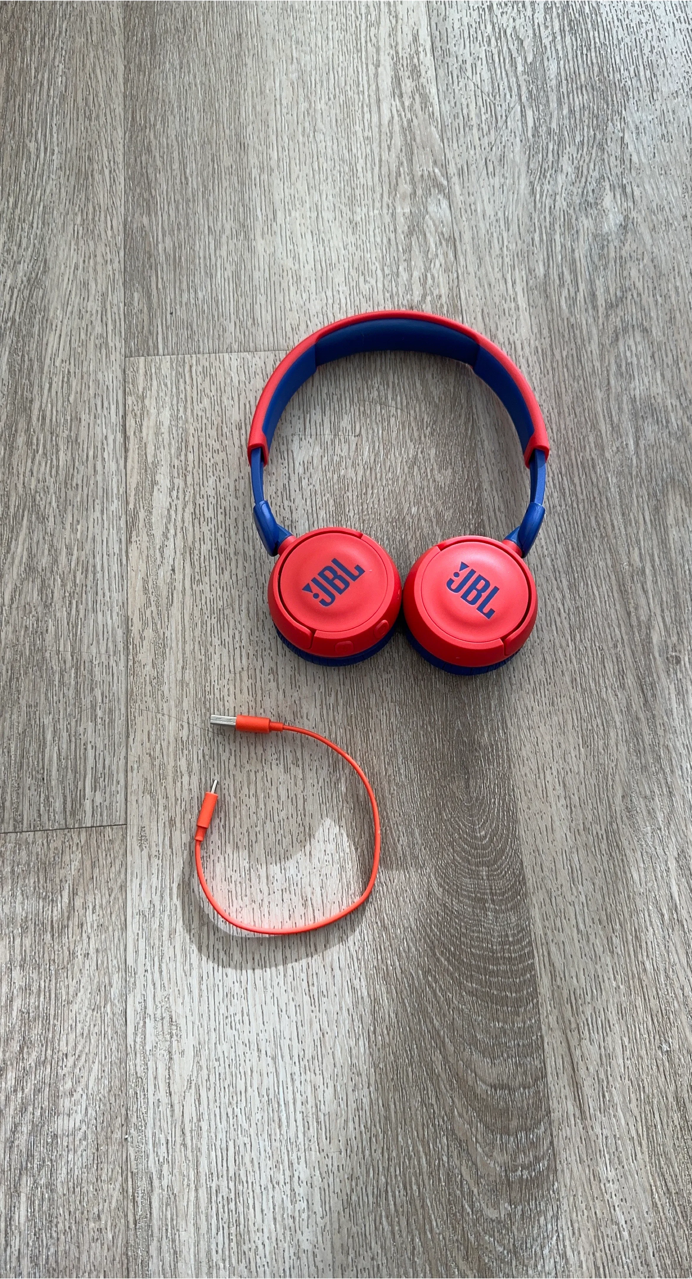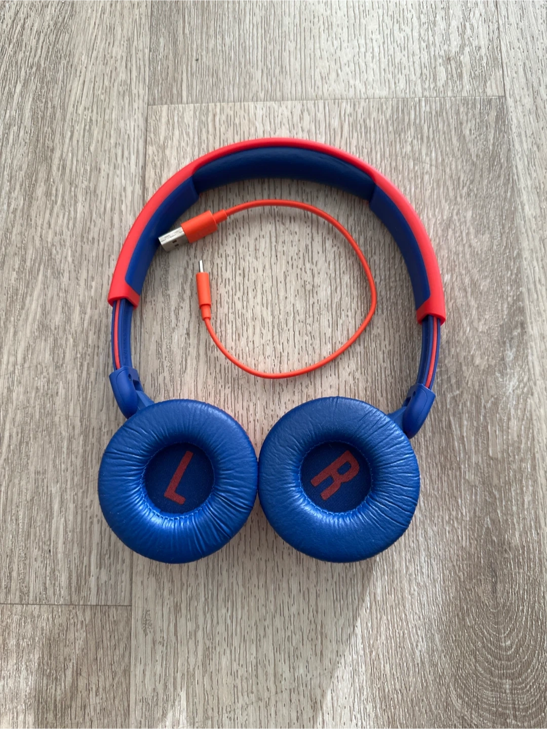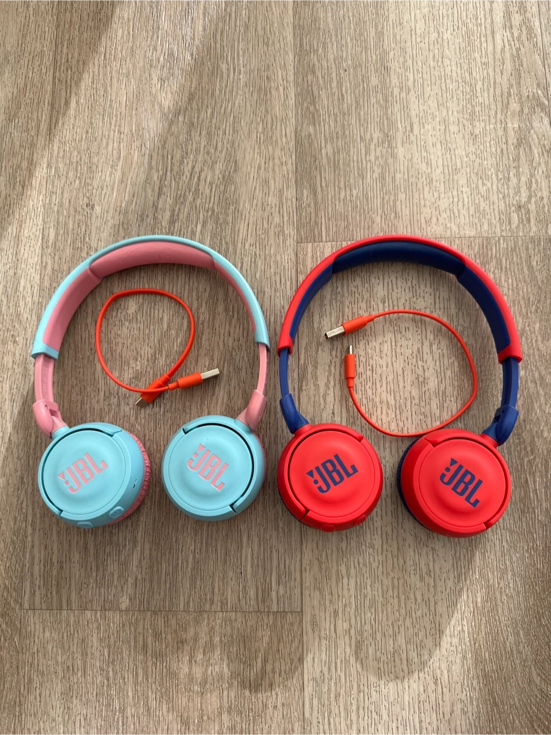 Two pairs of JBL JR310BT wireless headphones for kids! One is blue and pink, and the other is red and blue. Both come with their charging cables. Perfect for young music lovers!