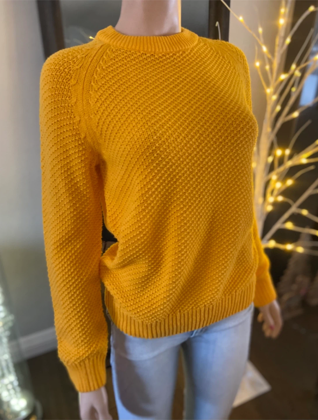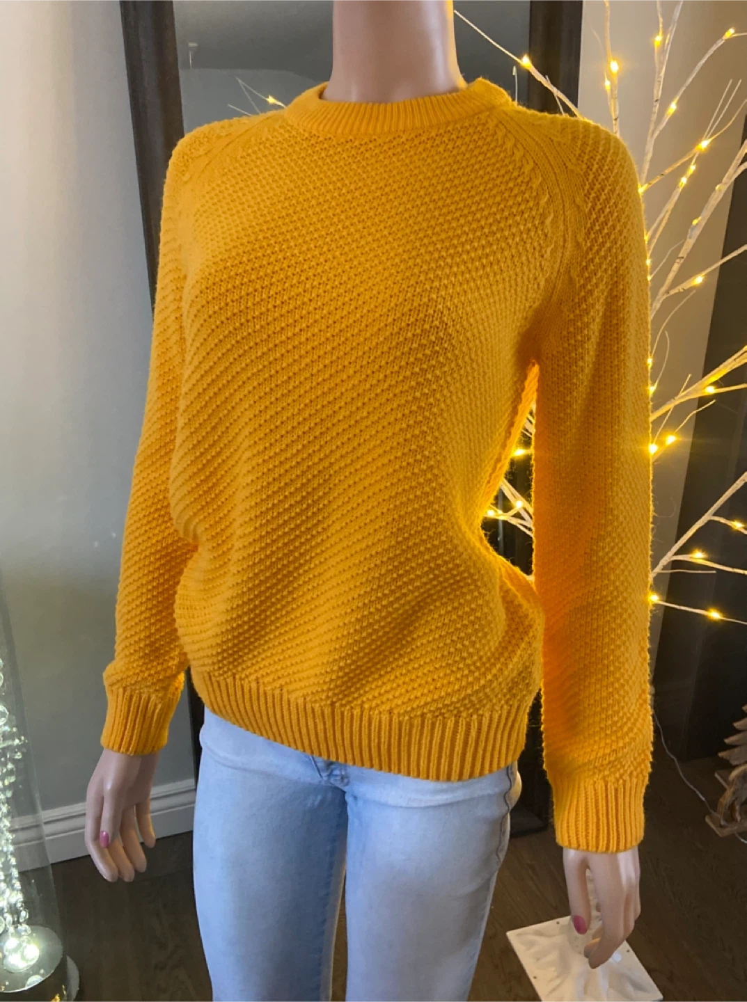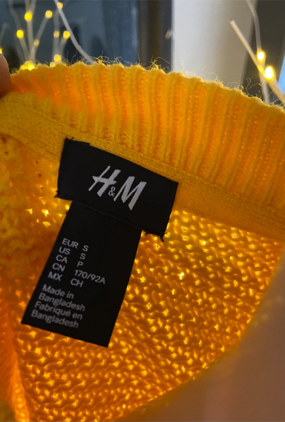 A cozy yellow knit sweater from H&M! It's in excellent condition and from a smk-free home. The textured knit pattern adds a stylish touch, perfect for layering or wearing on its own.