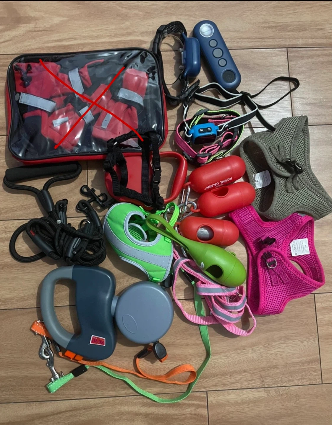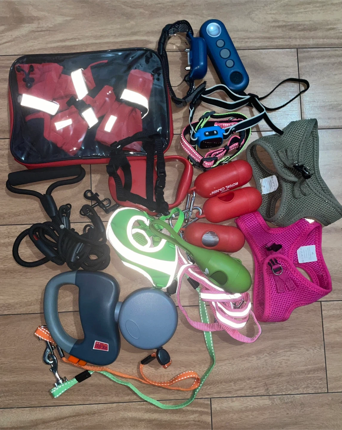 A bundle of dog accessories including leashes, harnesses, and other items for your furry friend! Includes various sizes and styles.