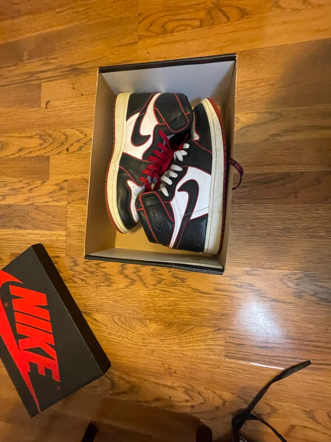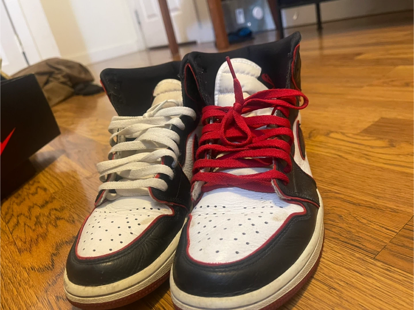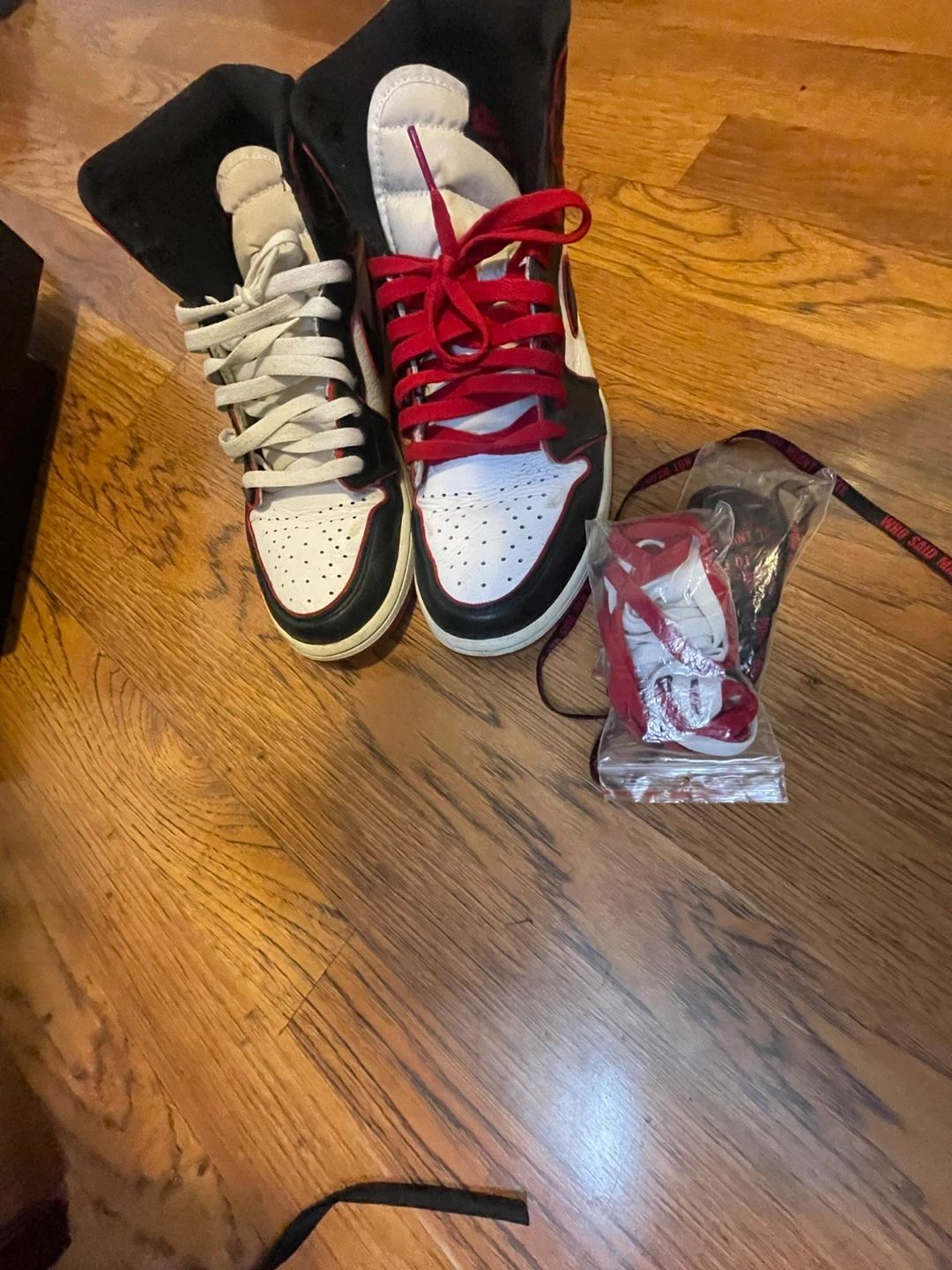 Selling a pair of Nike Air Jordan 1 Retro High sneakers. They come with the original box and an extra set of red laces. These shoes are in good condition and ready for a new home!